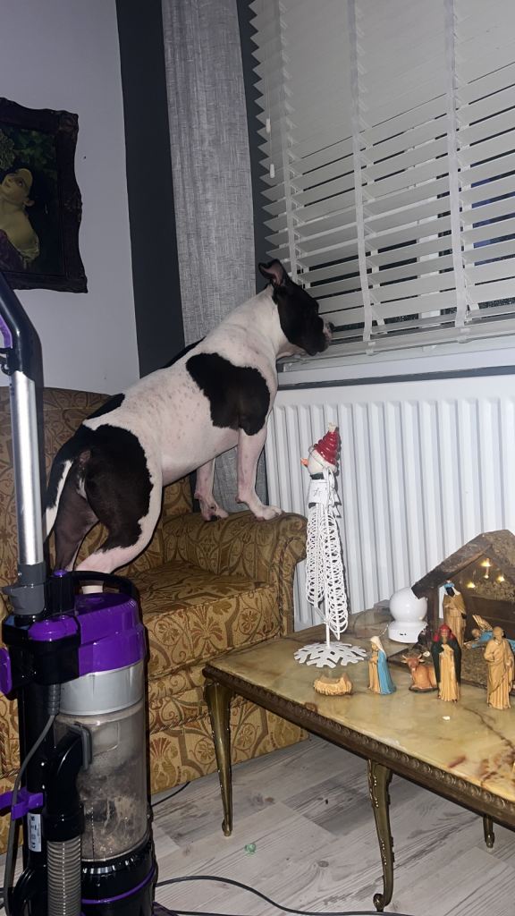2y old standard American bulldog, NOT an XL. He is not banned. Doesn’t need to wear a muzzle.