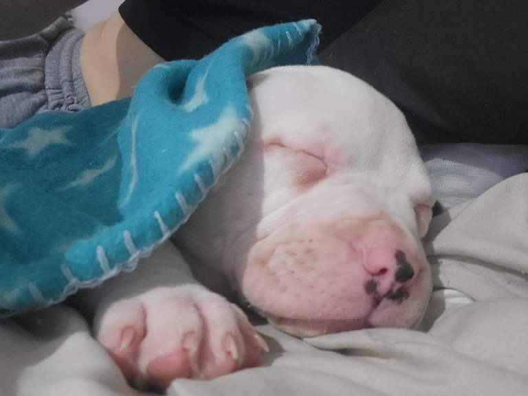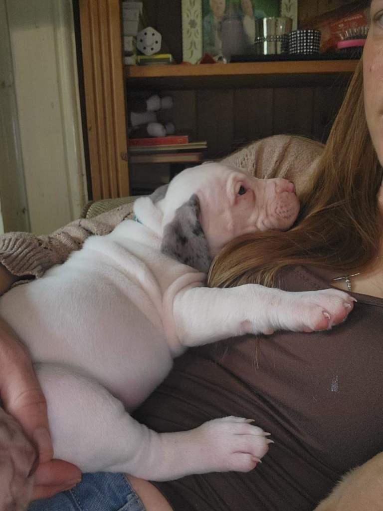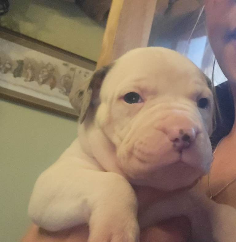 He is a lovely chunky puppy white with grey ears, he loves to play and he loves cuddles. He is a very chilled little puppy