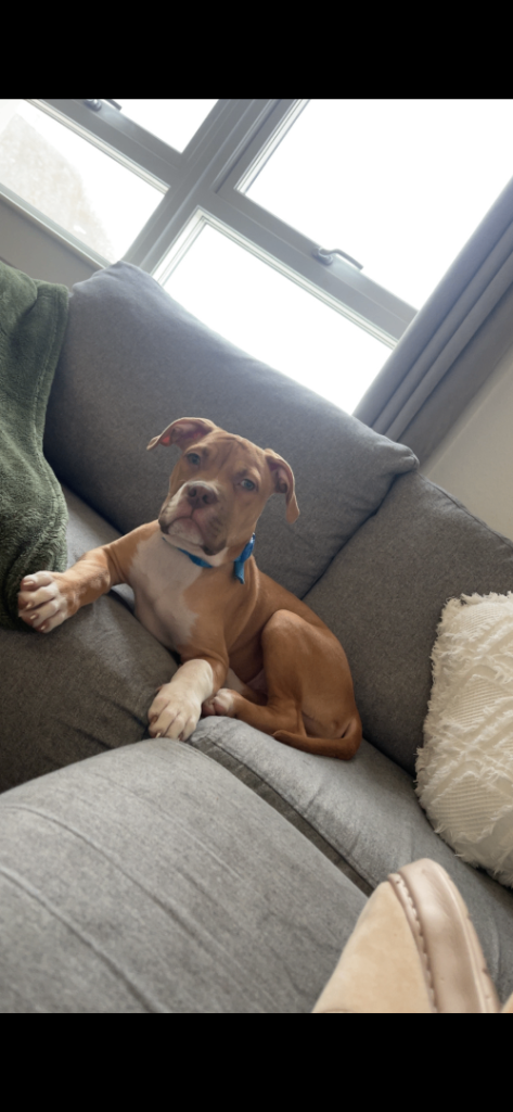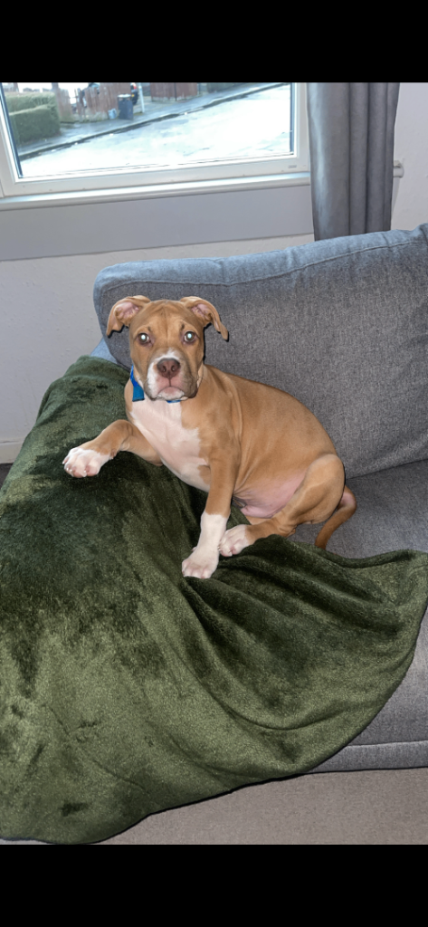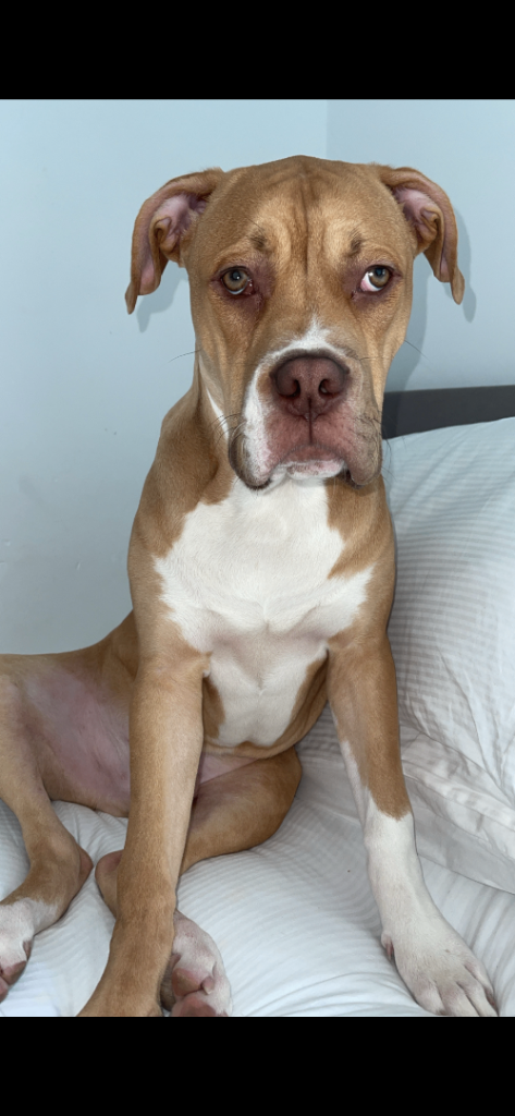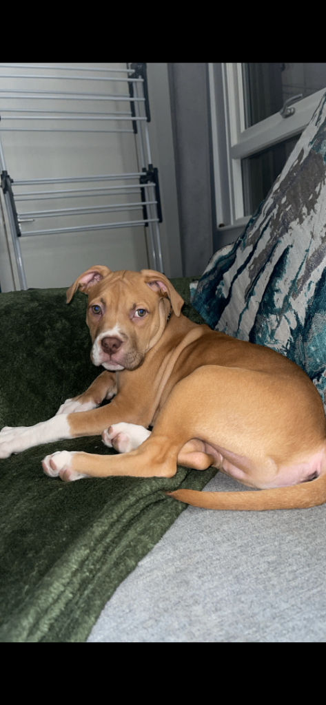 Micro chipped/vacinations up to date. Weighs 30kg at the moment biggest one from his litter. 6 month old American bulldog. Crate trained. Toilet trained. Only rehoming because he’s not good with children as I have 2 young kids and he’s snapped at them multiple times. Would recommend someone without young children. He loves a cuddle and is a very well behaved puppy apart from the issue with young kids. Good with other dogs, very playful & very energetic. Also sits and gives paws on command. Would like for him to go a loving home.