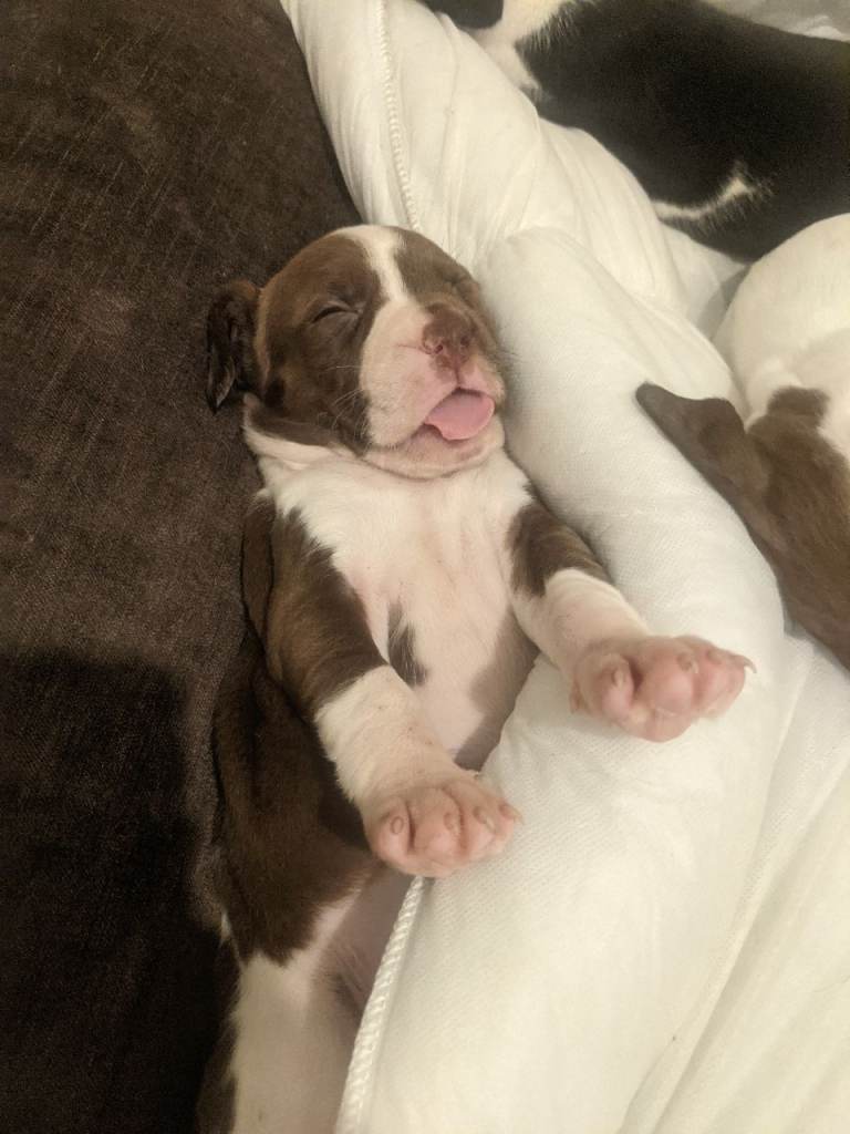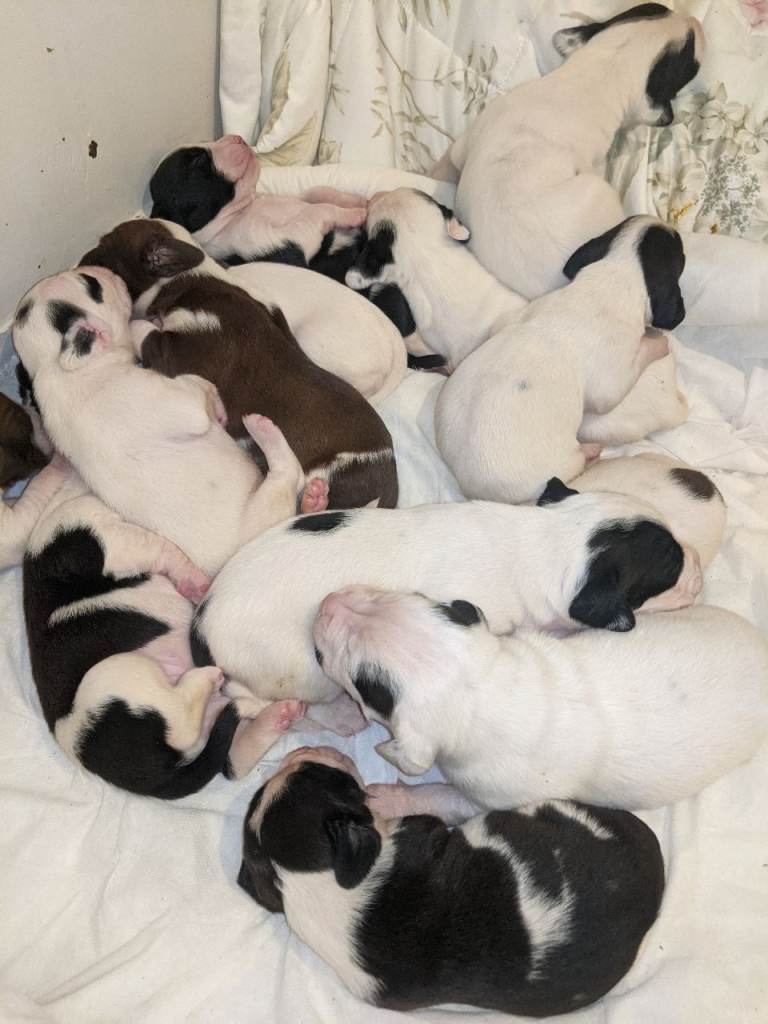 We have a real mix of colours throughout the litter, ranging from mainly white with black or brown patches to a very rare full tan with white patches,