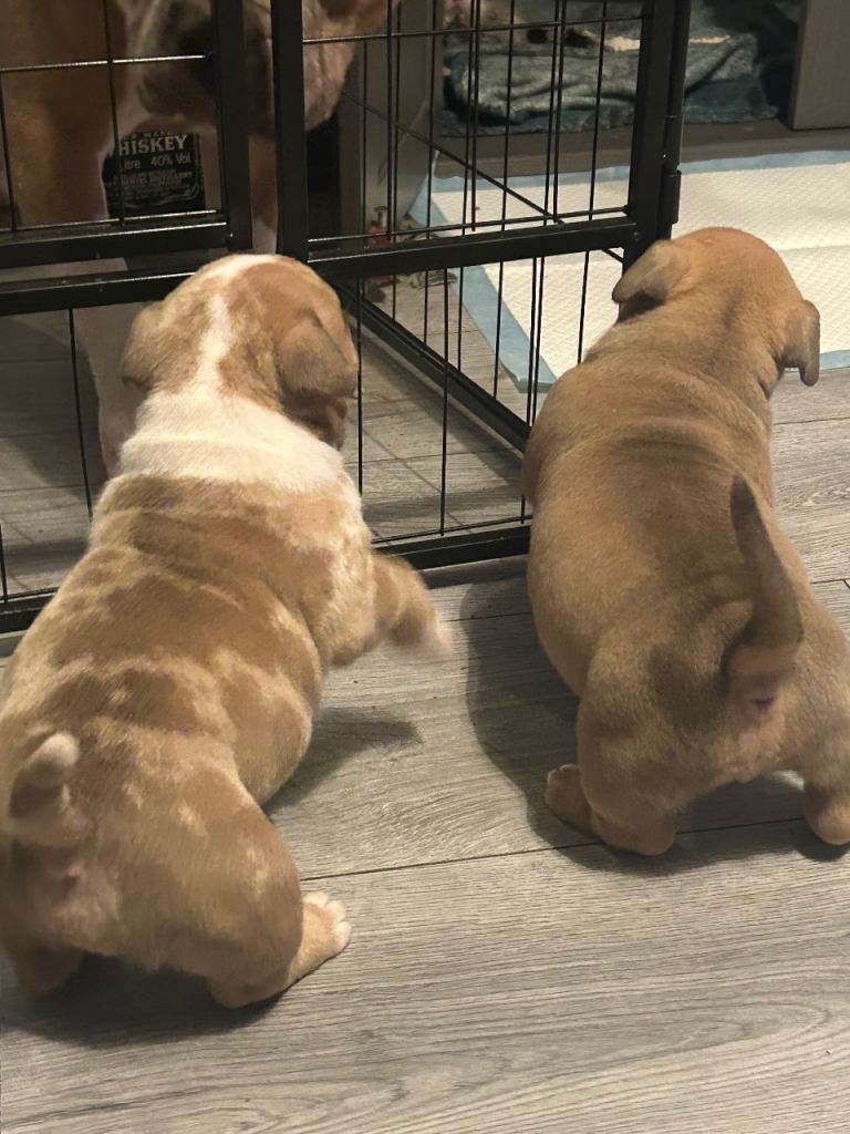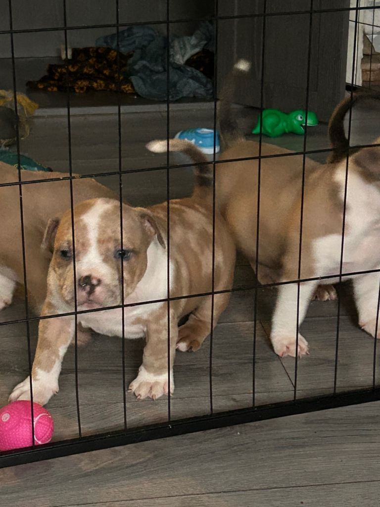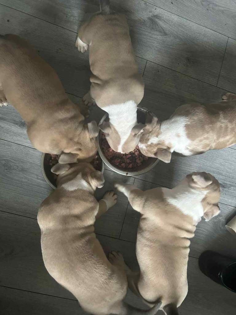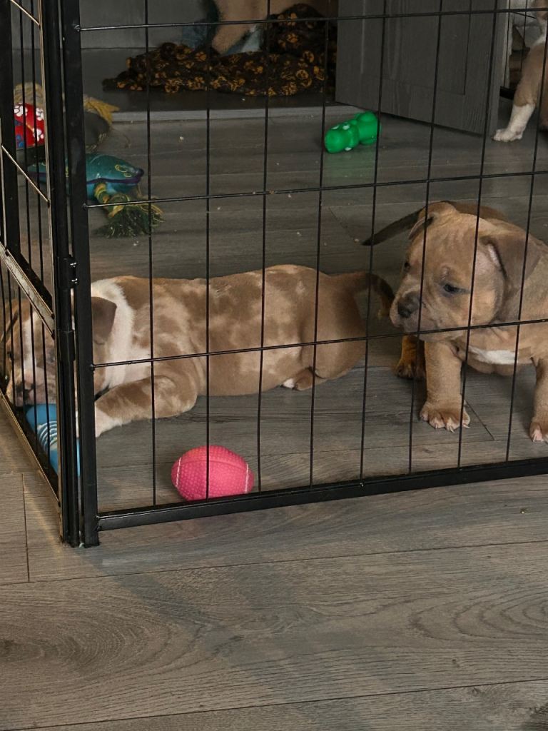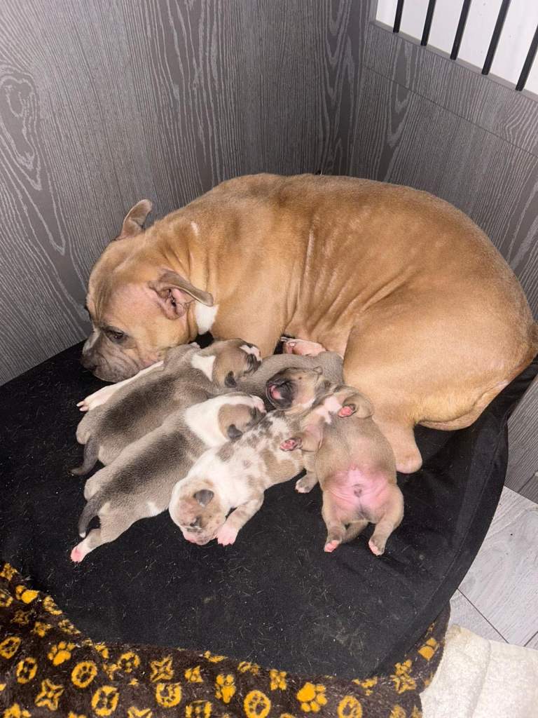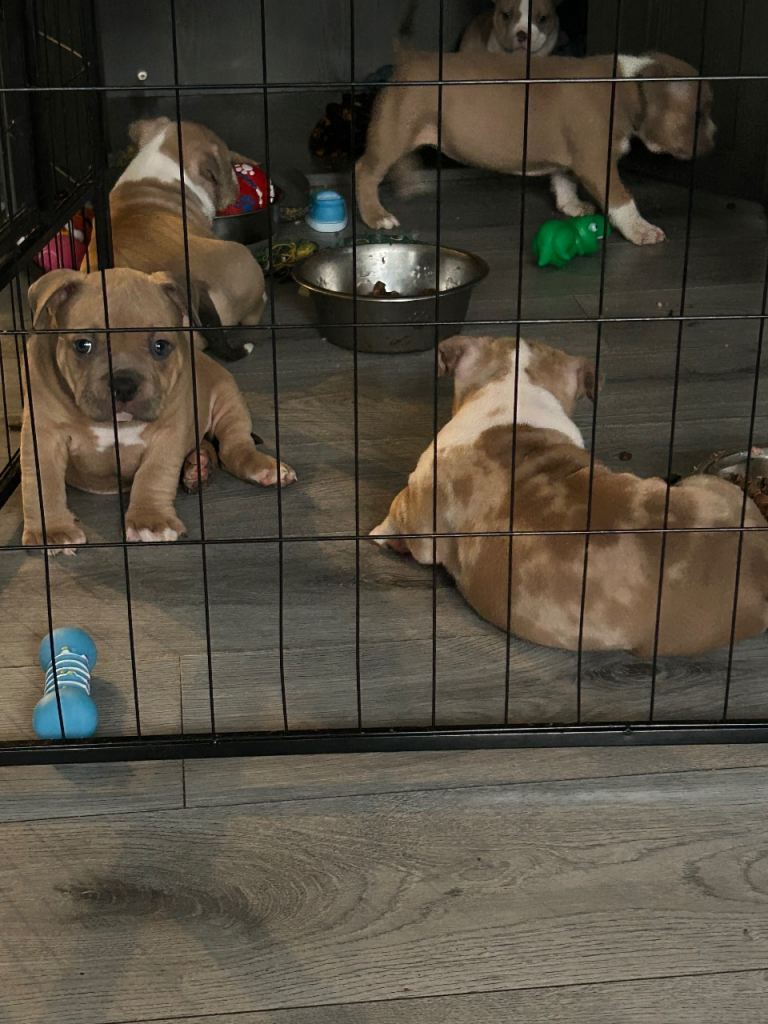 Ready to Go Home Today 🐶 Absolutely stunning litter born on Monday 8th of December 2025 🐶 Our beautiful Iris had a lovely litter of 5 gorgeous little babies to the amazing Enzo of Bronson bullz. They had 3 boys 💙 and 2 girls 🩷 We have 2 little boys looking for their forever loving home the 1 is lilac tri merle boy he is absolutely stunning and the most sweet gentle boy out of the 5 he will be one amazing dog £2500 2 is tri lilac fawn boy he is a quiet little boy who loves playing with his toys he is so laidback and loves a little cuddle £2000 The bloodlines in these pups are some of the best names available bloodlines like Musseltones magoo x2 Musseltones calypso x2 City of bullies rocko-mania