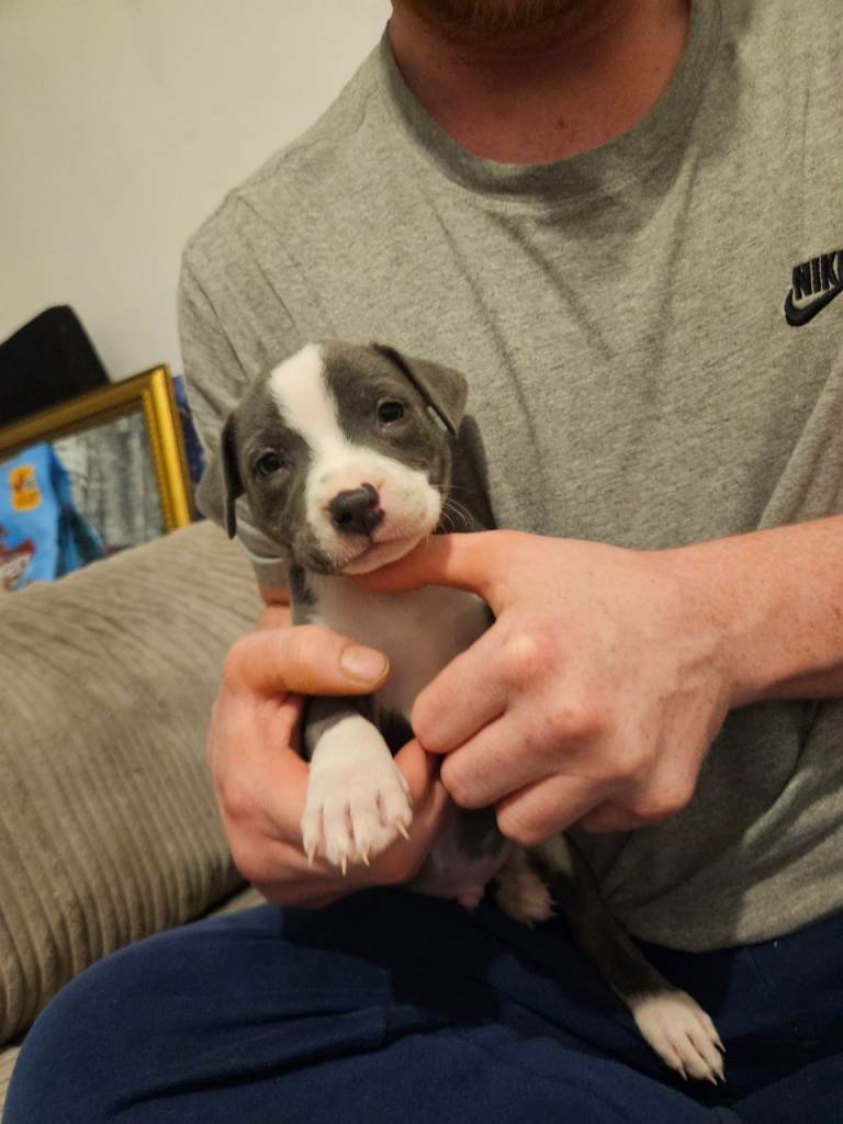 Here we have 1 beautiful blue staffordshire bull-terrier pup left born on the 30th November 2025 will be ready to go in a week's time. Mum and dad are both loved family pets (not related) they are healthy and always have had regular health checks, they can be seen with the puppies. Puppies will be microchipped flead and wormed will also have their first vaccination. We want the puppies to go to a good forever home The pictures do not do them justice so if you want to come and have a look please do! If u any questions just ask do not hesitate thanks