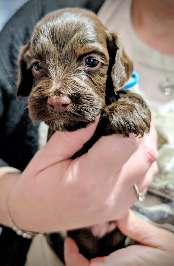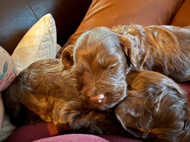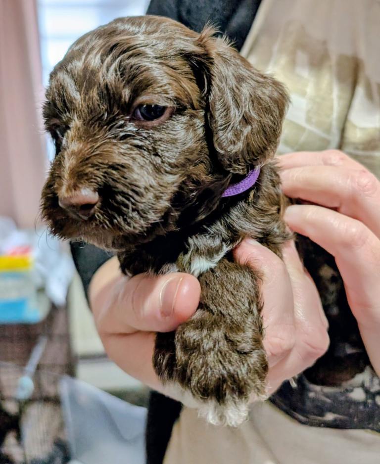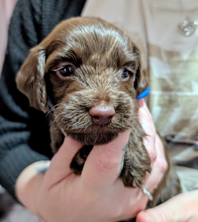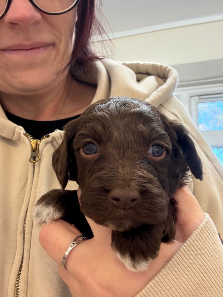Monty and Belle are proud to introduce their gorgeous litter of chocolate Cockapoo puppies, all with stunning white markings and the most adorable curly coats and long lashes. A lovely mix of boys and girls, each with their own sweet and unique personality.