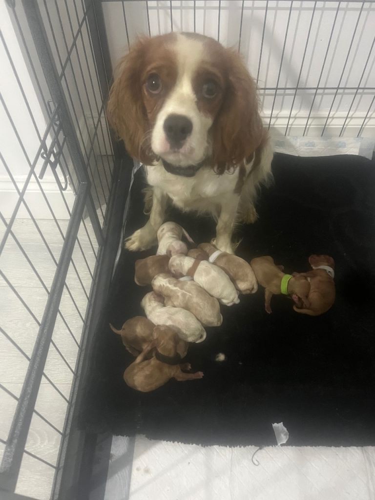 Our luna has had a beautiful litter of 11 cavapoos this is her first litter and she has done a brilliant job raising them