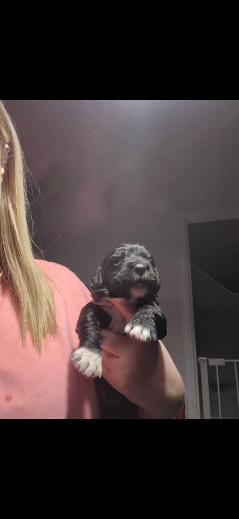 We have 3 beautiful Sprocker Spaniel puppies looking for their loving forever homes – 2 black & white girls and 1 black & white boy.