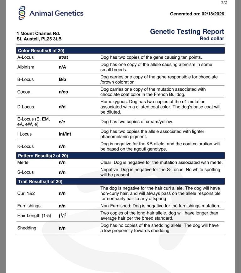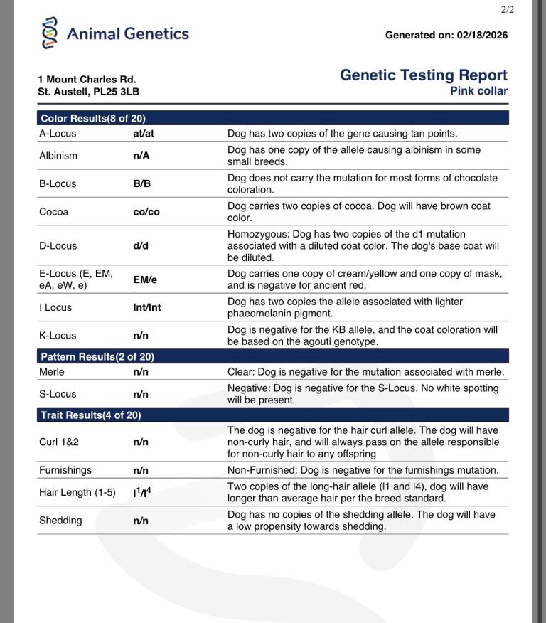 All health checks and dna done by animal genetics all dogs been vet checked also