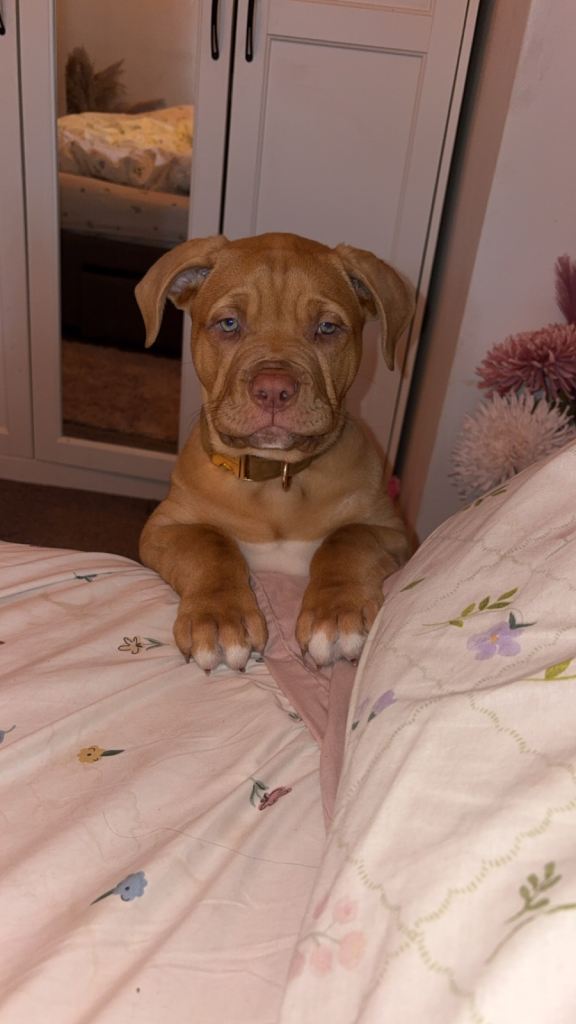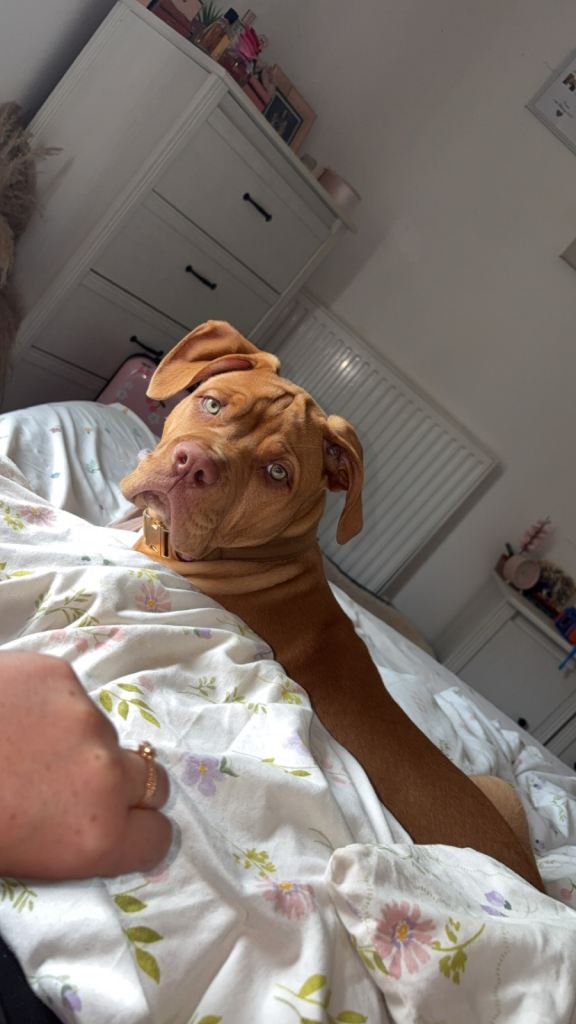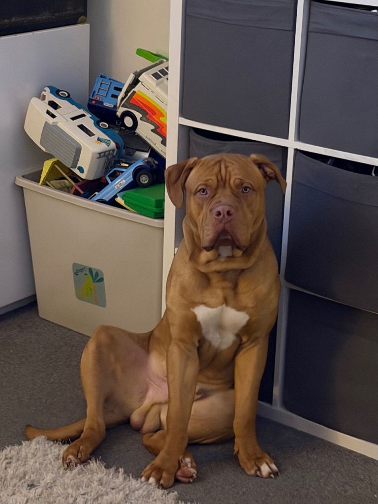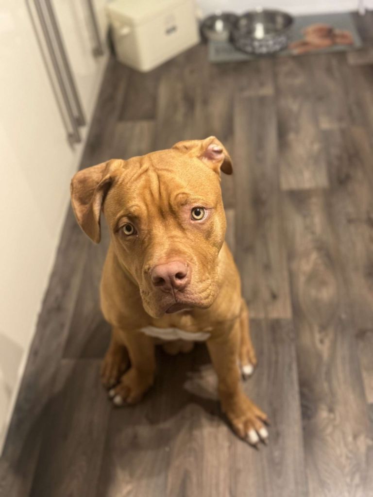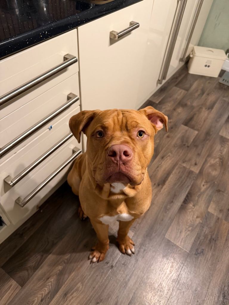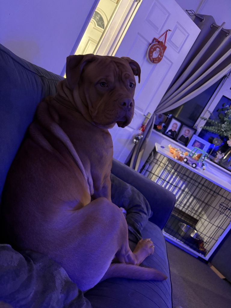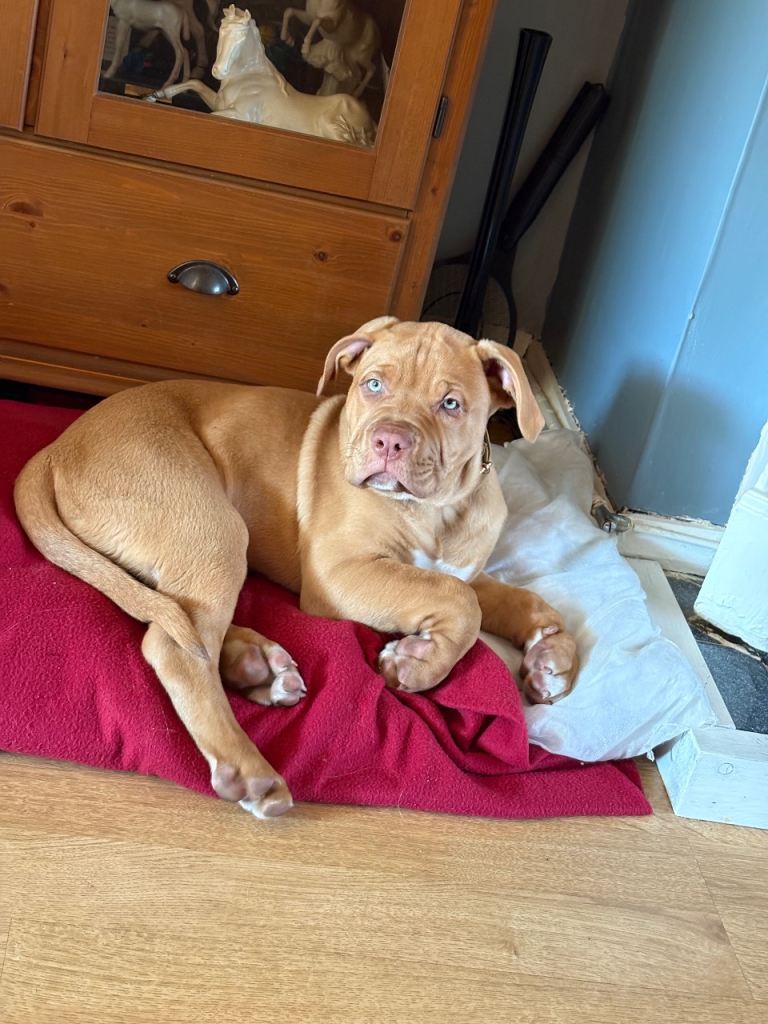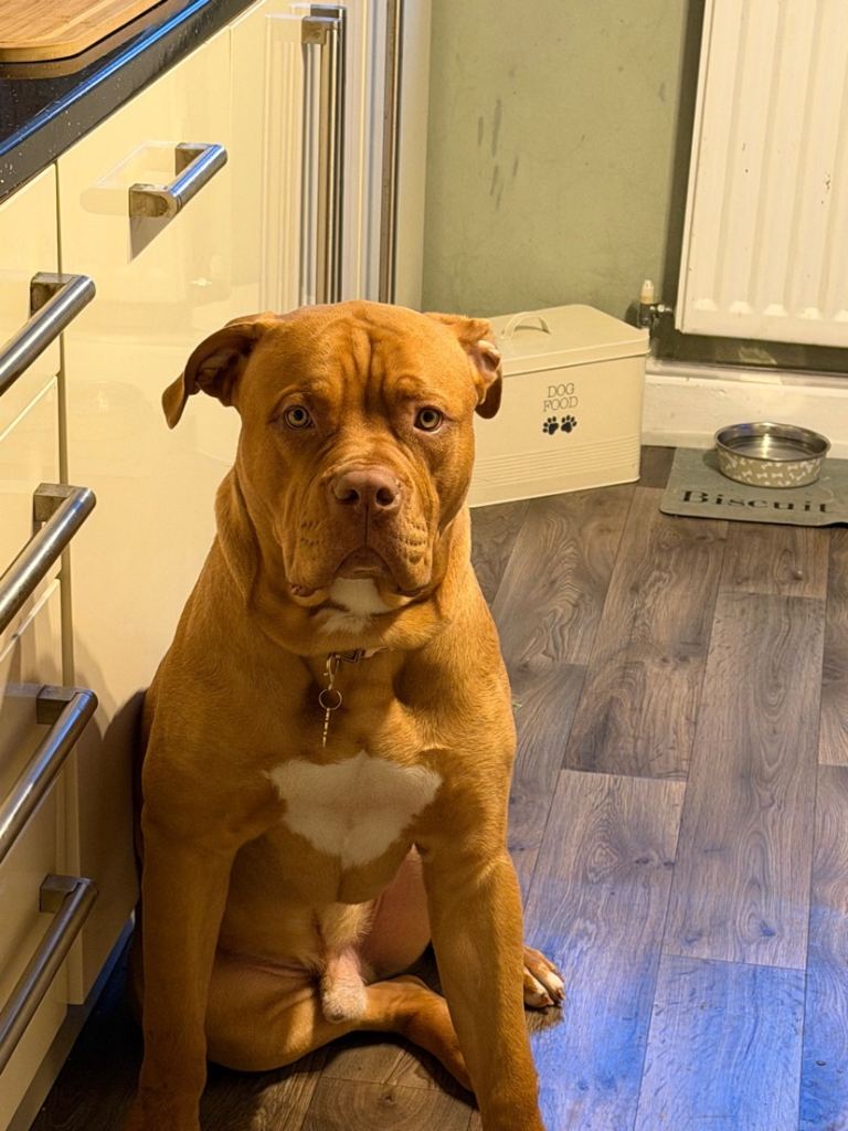 This is biscuit. He’s an 11 month old dogue de Bordeaux cross American bulldog