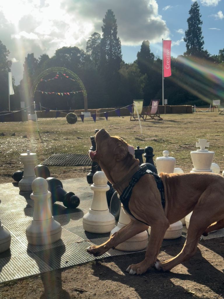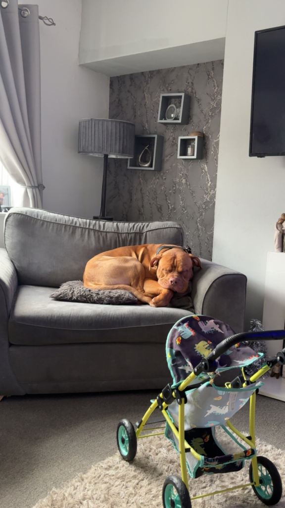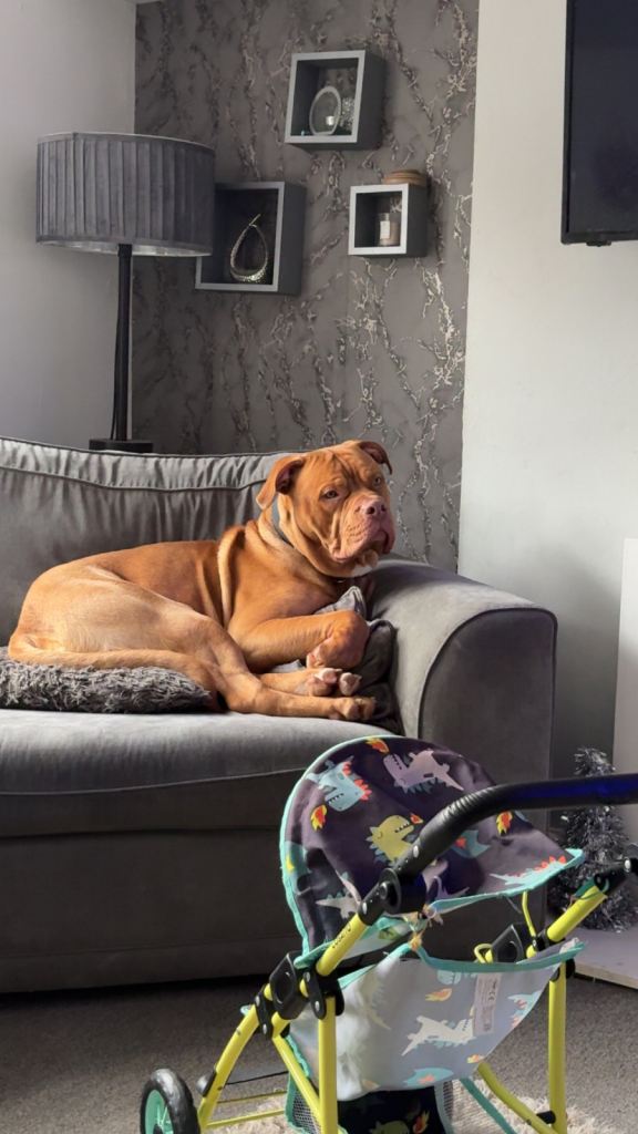 Currently lives with 3&4 year old but can get a bit bouncy when excited or kids are running around and will try join in playing and running but due to his size often ends up like a bull in a china shop 🤣 so would recommend a household with bigger children.