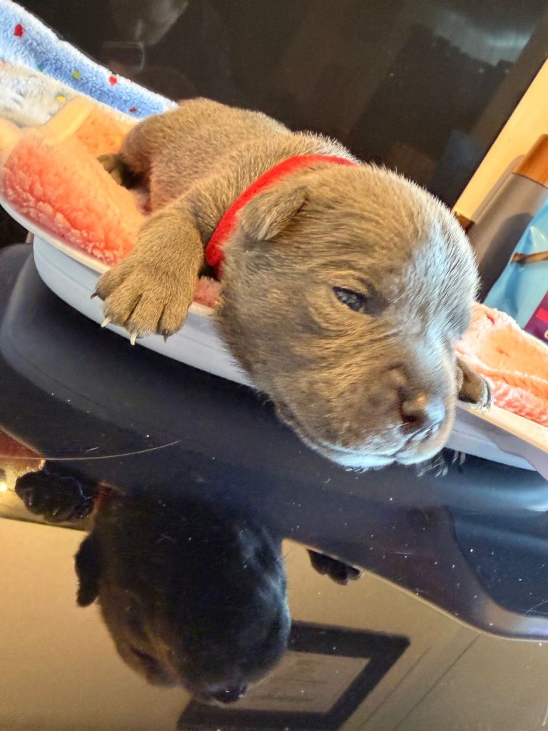 DAM: Remi is a full pedigree blue Staffordshire bullterrier but unfortunately is not KC registered, although I do have copies of her bloodlines she is the daughter of “KENZDUO TAGLIATELLE”.