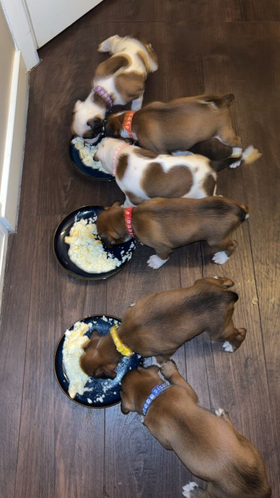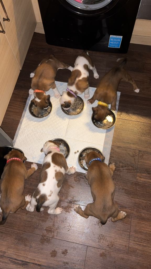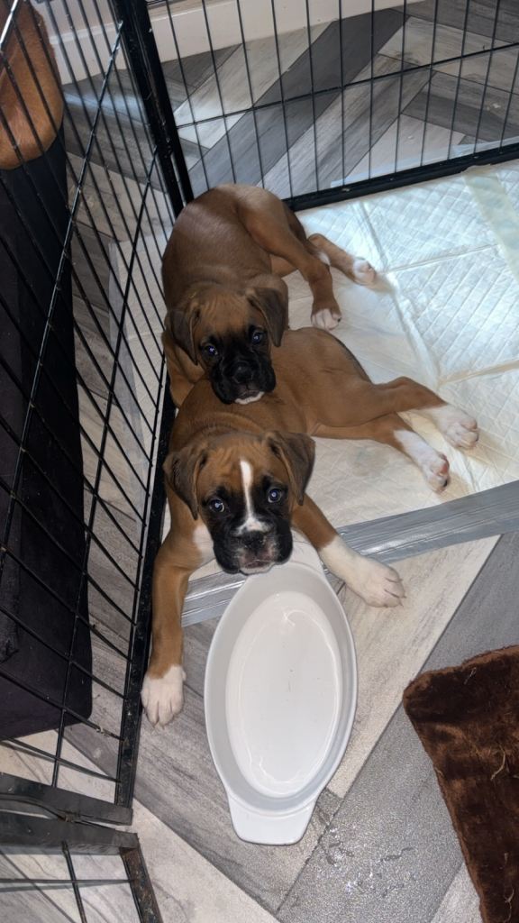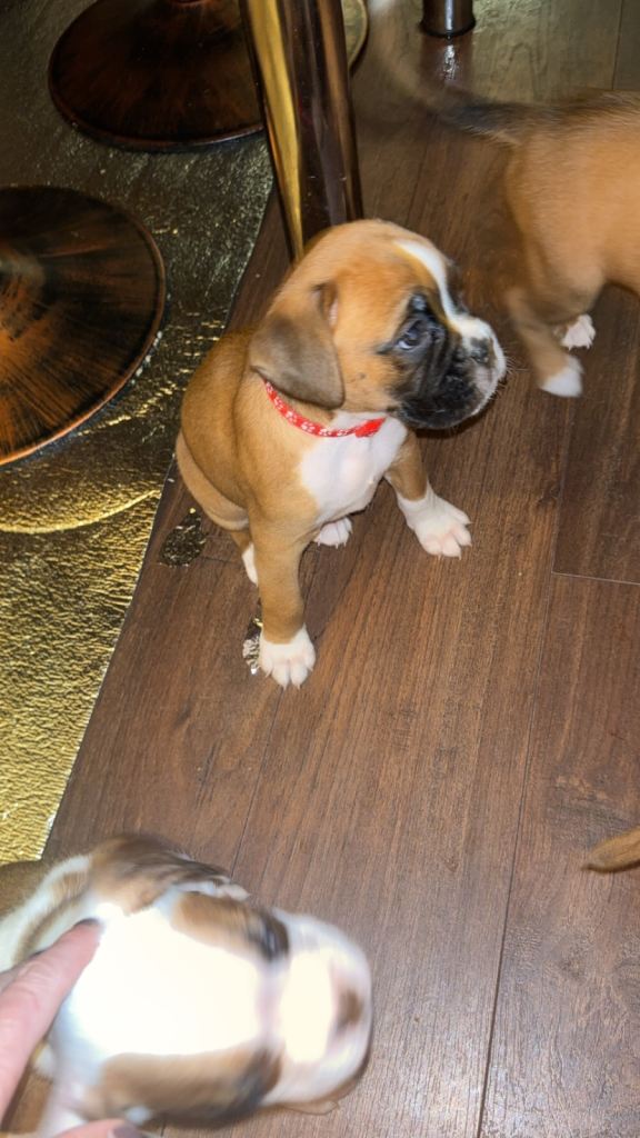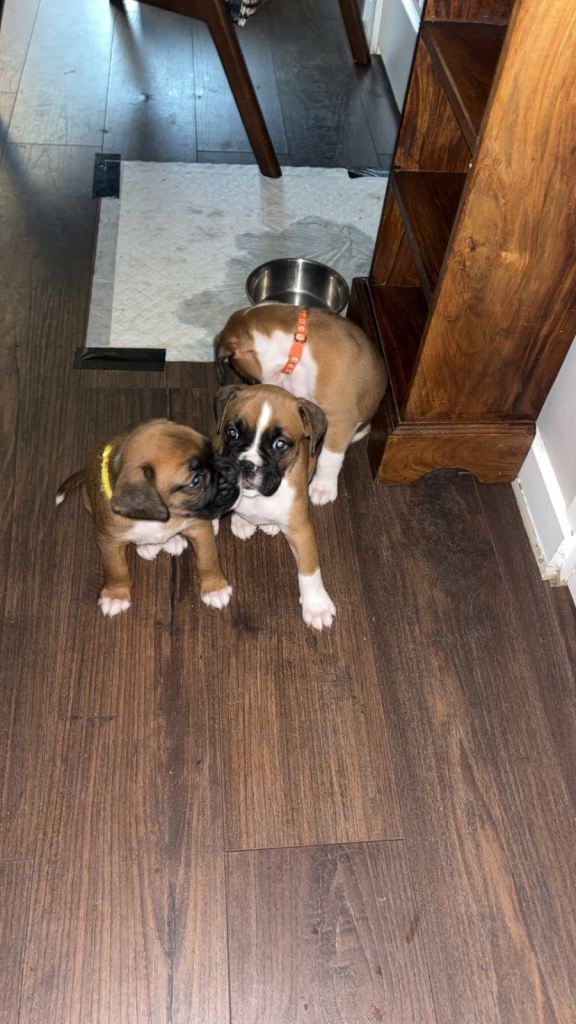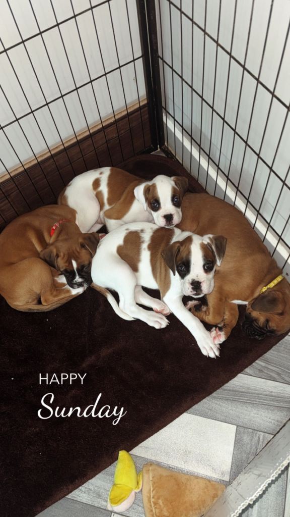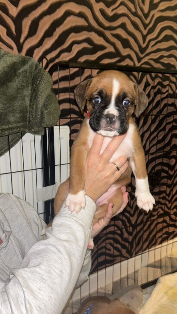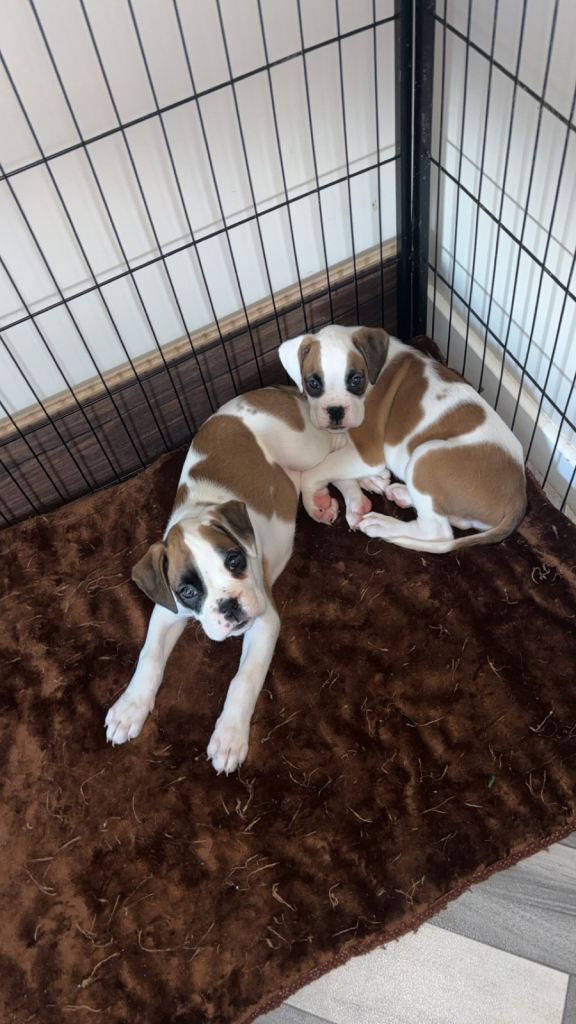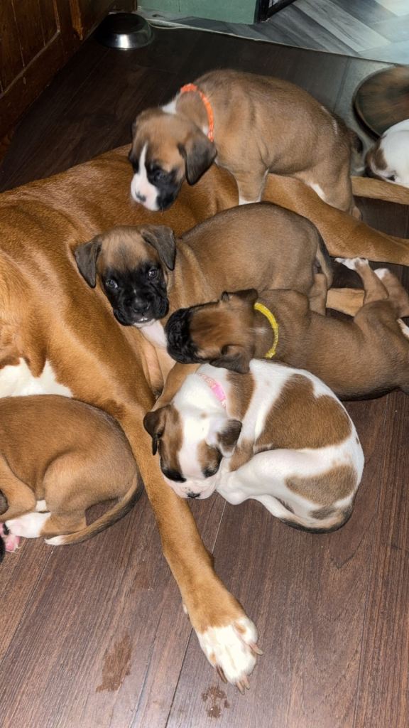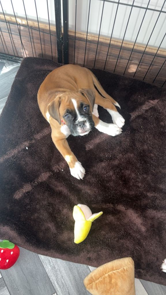 Here we have some wonderful full breed boxer puppies! Well looked after, sociable and looking for forever homes. 1st vaccination and health check completed 19/02/2026, microchipped wormed and flea treatment. 5 bitches and 1 boy- only 4 bitches left. (Red, purple pink and yellow available).
