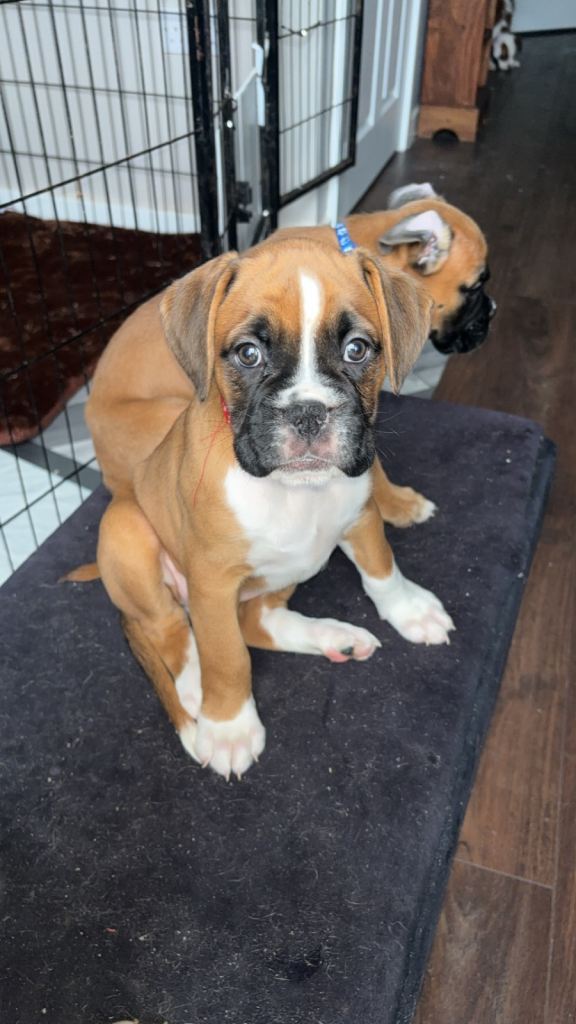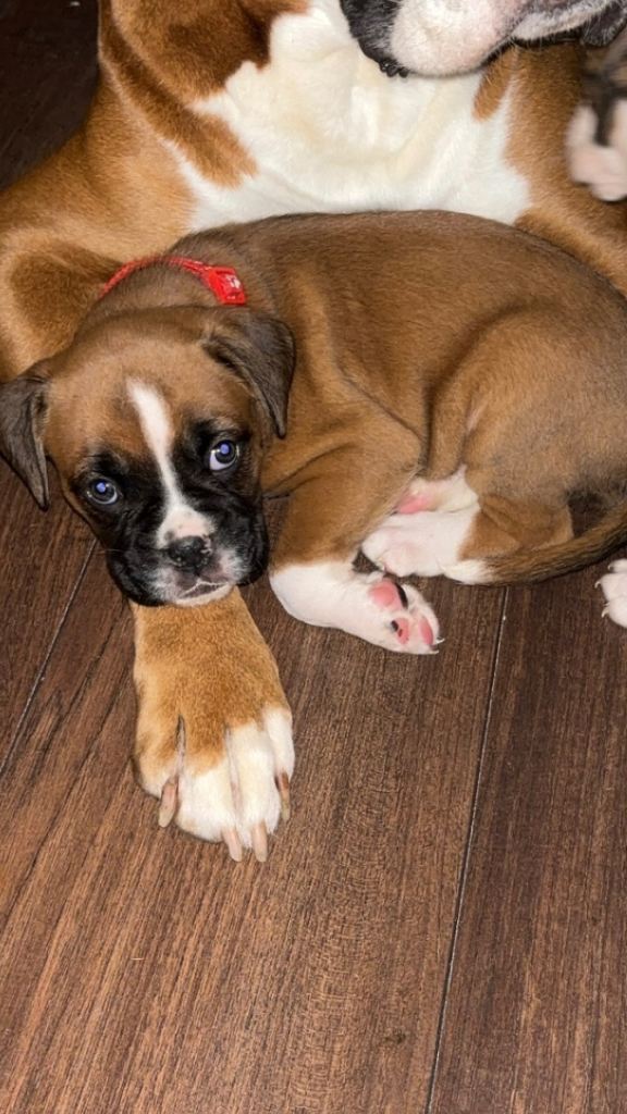 Dad is a KC Registered Boxer with relevant paperwork. Champion bloodline and has grown up with Mother Trinity still living together in the family home. He’s very intelligent almost human- protective but the softest loving nature like Trinity. All paperwork provided in your personal folder.
