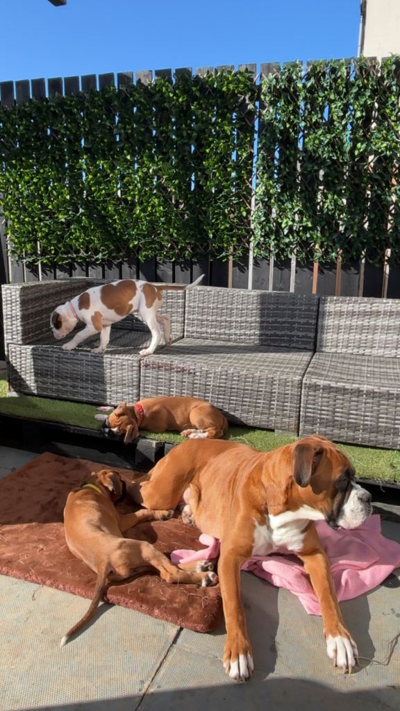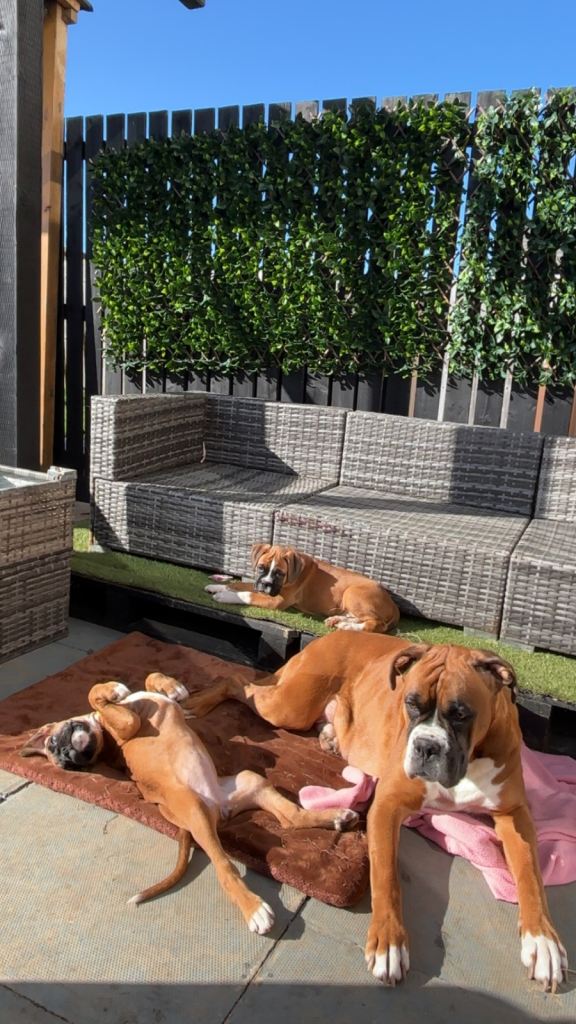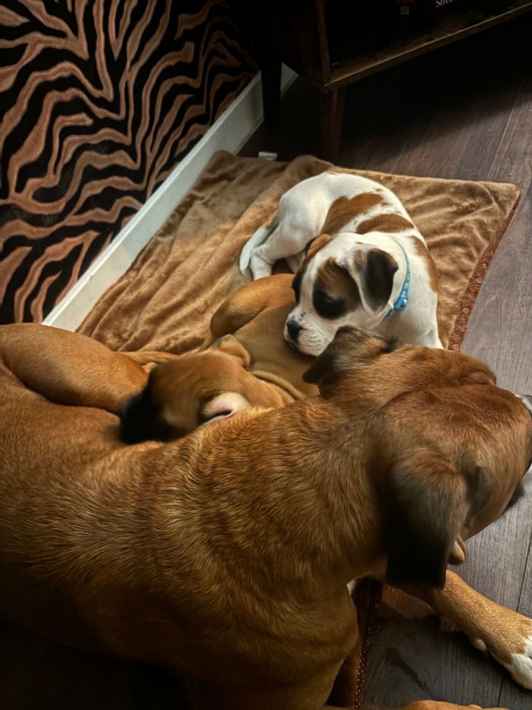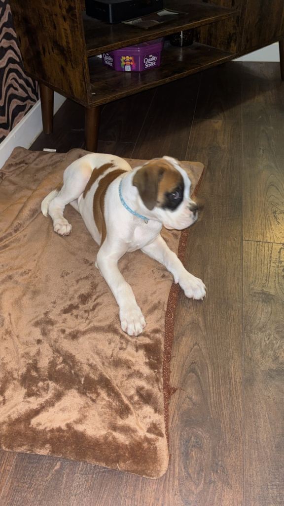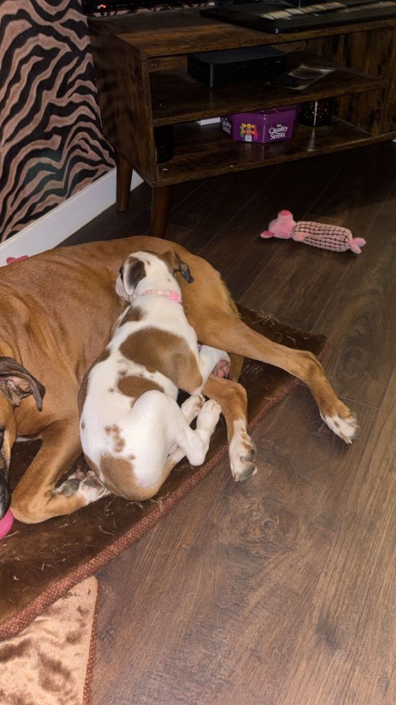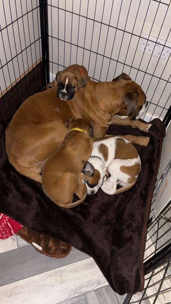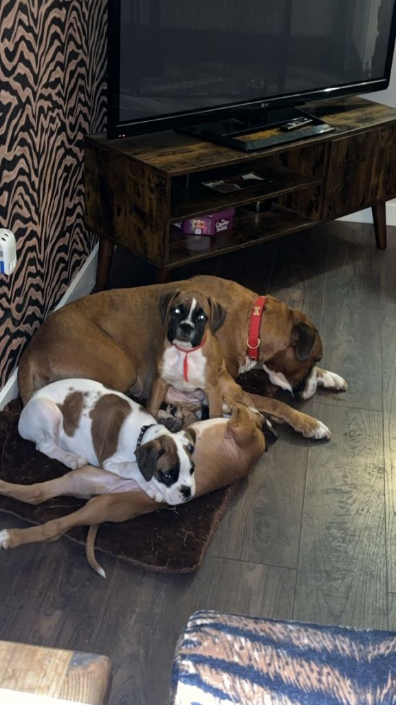 Dad is a KC Registered Boxer with relevant paperwork. Champion bloodline and has grown up with Mother Trinity still living together in the family home. He’s very intelligent almost human- protective but the softest loving nature like Trinity. All paperwork provided in your personal folder.