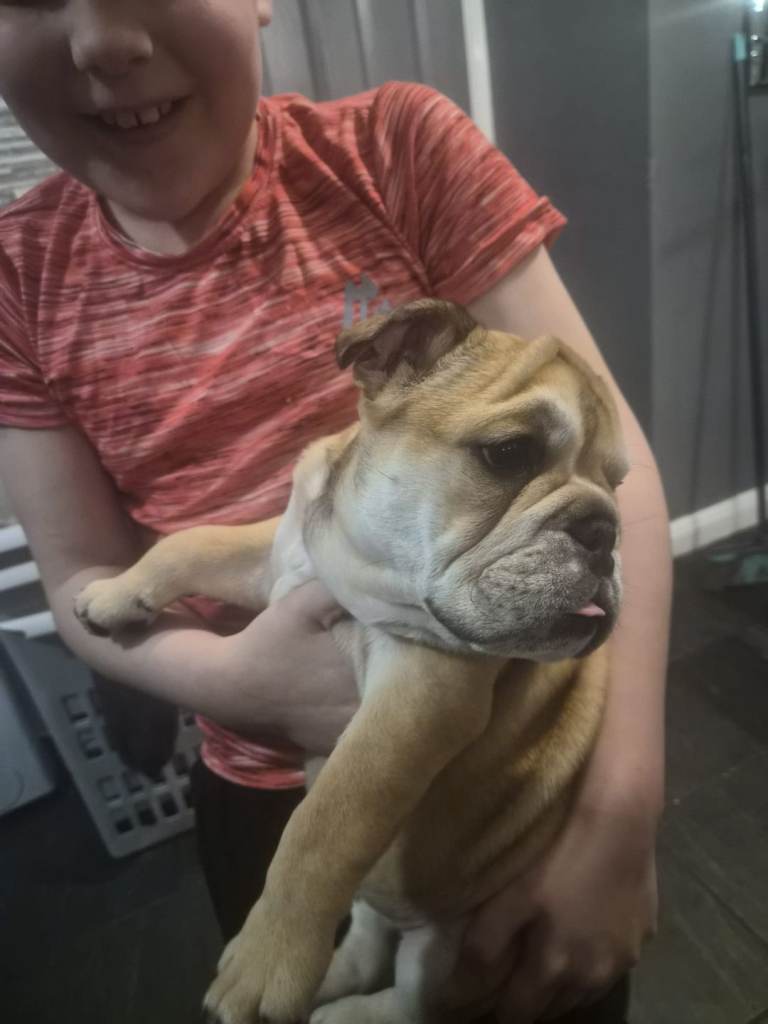 4 months female british bulldog has had both set of injections she is microchipped great pup no papers hence price