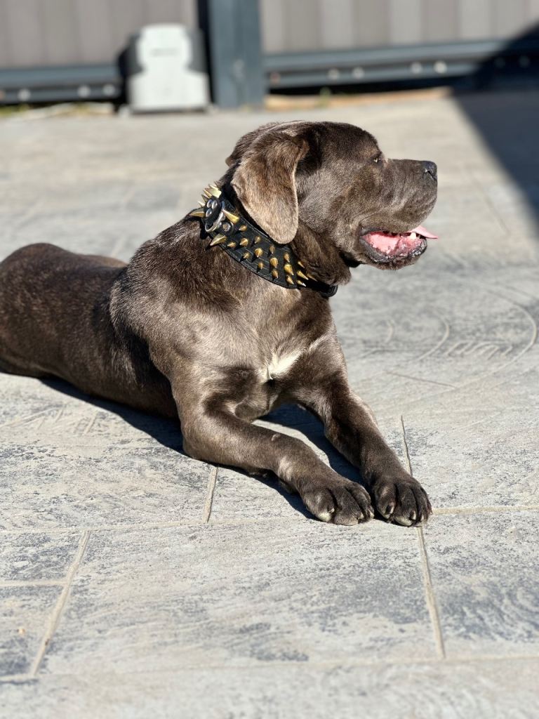 At 6 months, she spent two months with a professional trainer learning basic obedience. When she turned 2, she returned to the same trainer for advanced obedience work. Since then, I've continued her training myself. She has grown up surrounded by love from my children, and as is typical of the Corso breed, she is affectionate, gentle, and protective with family members.