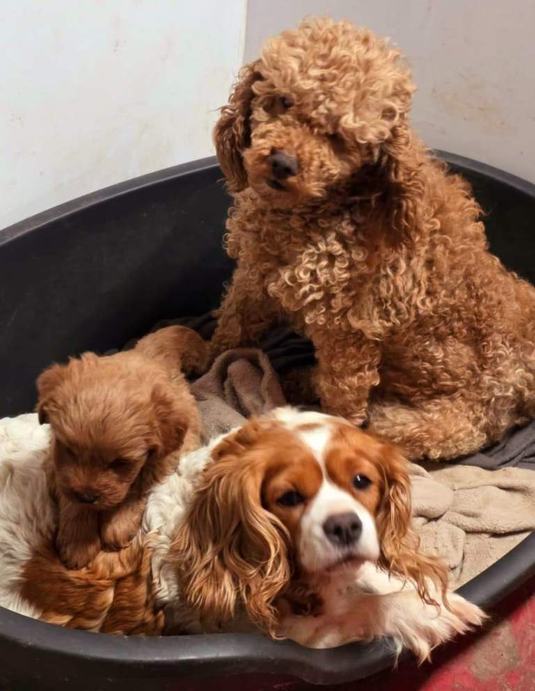 9-week-old red male Cavapoo available. Mum is a King Charles Cavalier and dad is a miniature Poodle (both pictured). Very friendly and playful, raised in a home environment.
