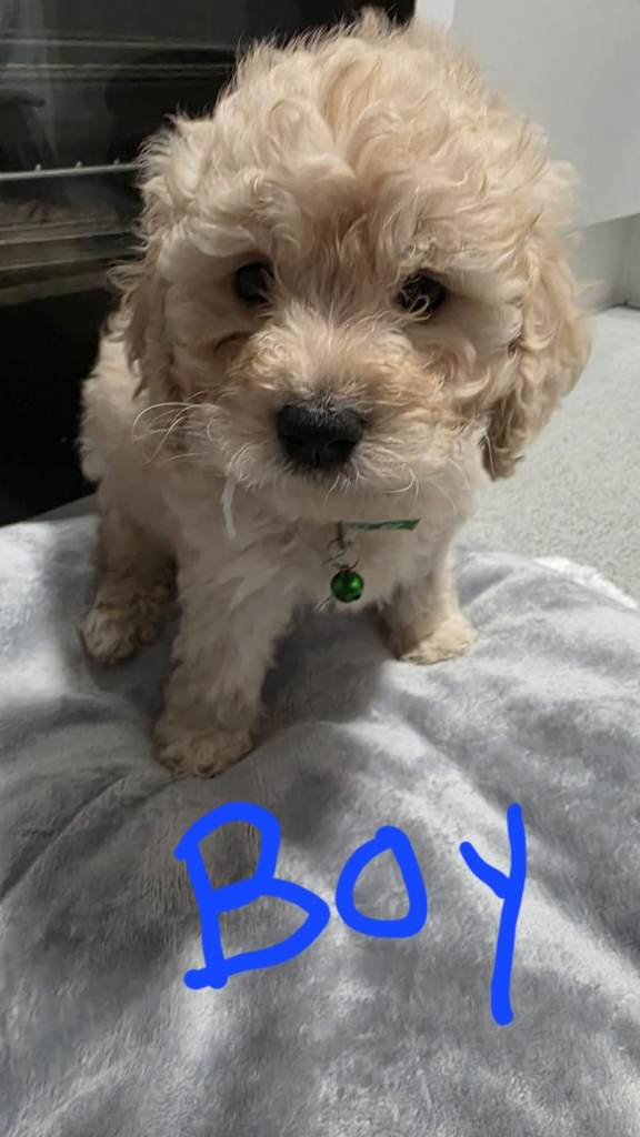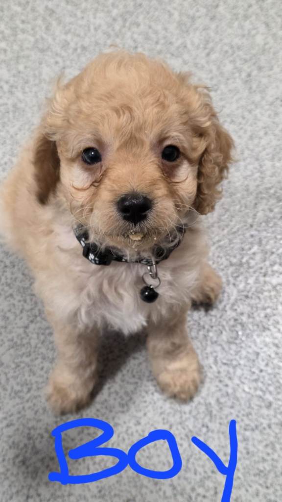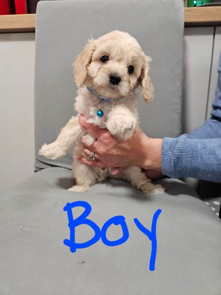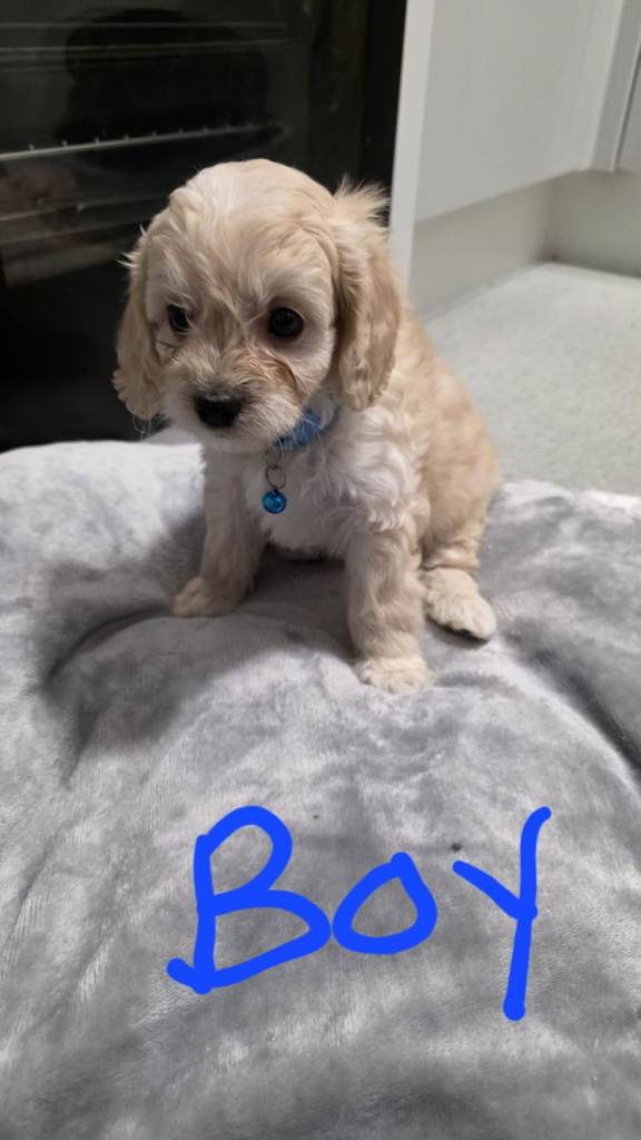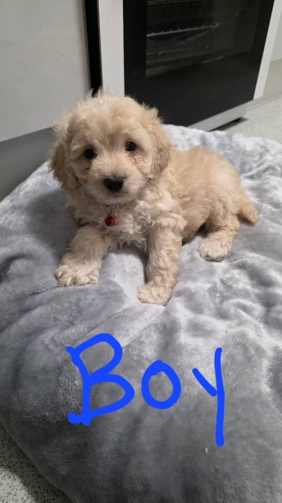 Honey's puppies were born on 22nd January 2026, they are now 12 weeks old, I have 6 Cavapoo puppies avaliable and ready to go from the 21st March, I have 4 Boys & 2 Girls all very cute. Mum is 4 and a half and I have had her since 8 weeks old, she is very friendly and super calm but with lots of character. Dad I don't own, he is miniature white poodle and quite small named Custard. Together they have created 6 beautiful puppies all cream and white coloured. The puppies have had worming treatment every 2 weeks. At the moment they are on Opti life baby weaning food and are almost fully weaned from mum. The puppies are very playful and are already showing that they have there own personalities. They live in my kitchen so they are very use to busy household noises. To reserve a puppy I will require a deposit of £550 which is non-refundable and the rest is to be paid on collection. They will be microchipped and have had there first injection when collected. Please get in touch to arrange a visit or if you have any questions you might have and I am happy to assist and give advice if needed. Thank you xxx