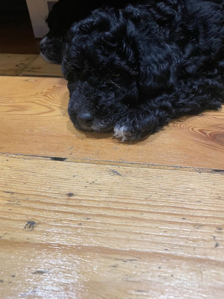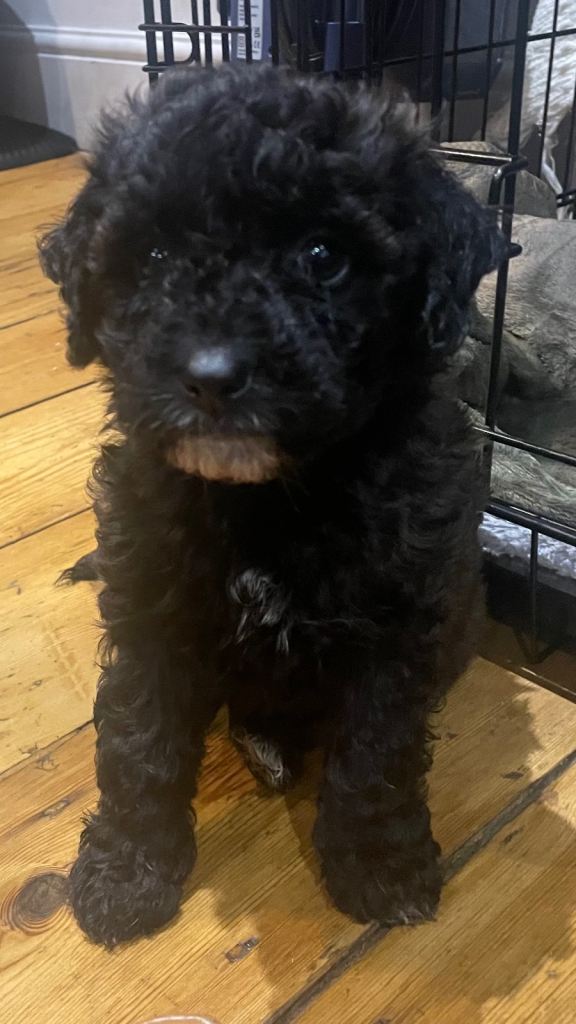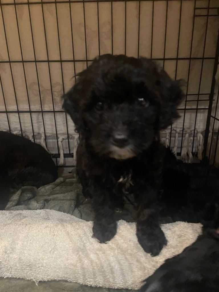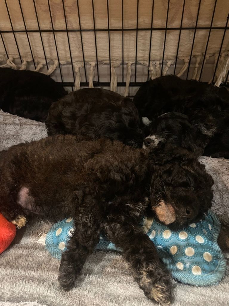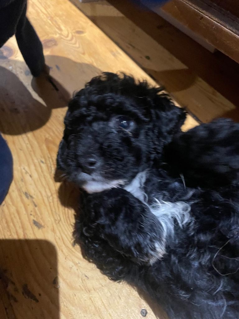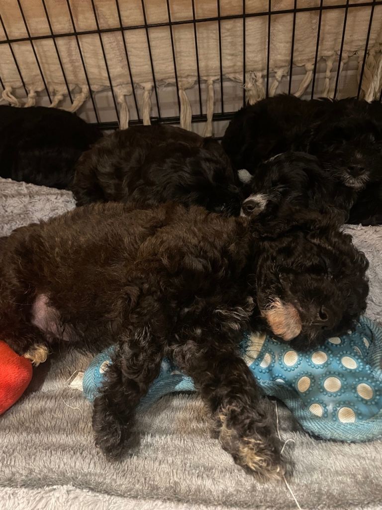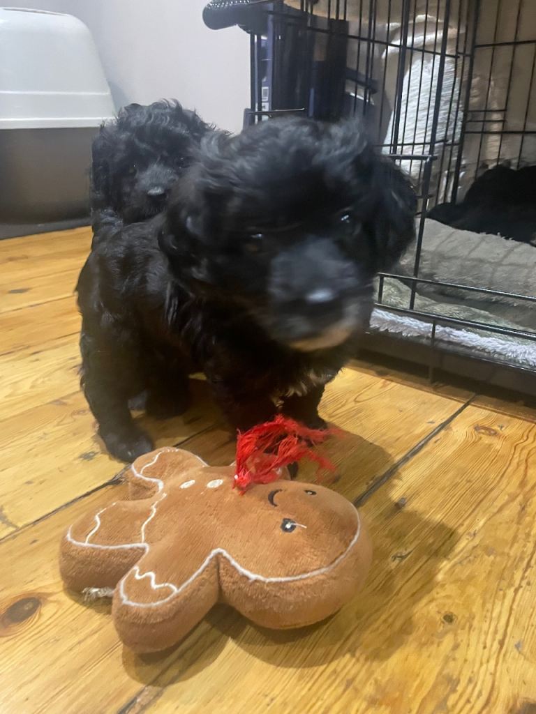 Toy cavapoo puppies for sale. Litter of 9 - 5 boys and 4 girls. Wavy coats either a mix of black, brown with little bits of white.