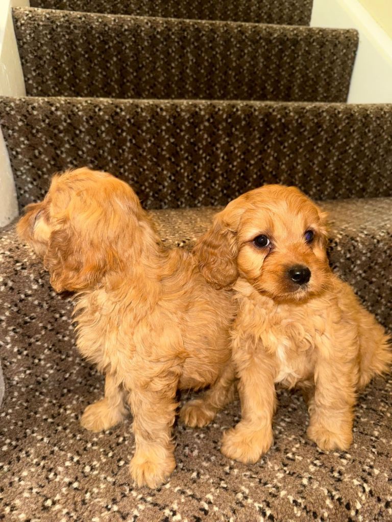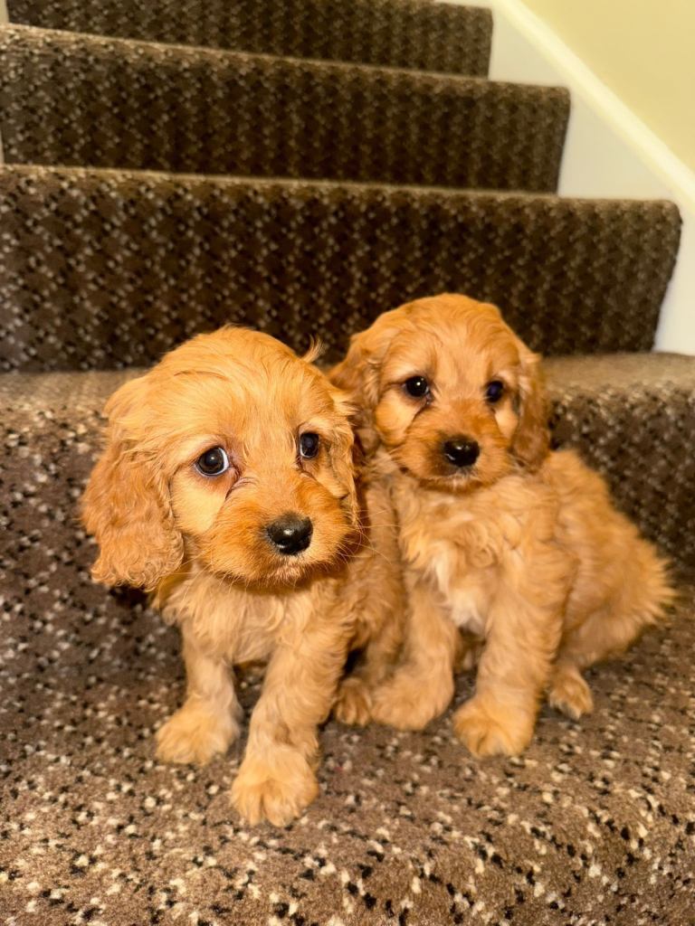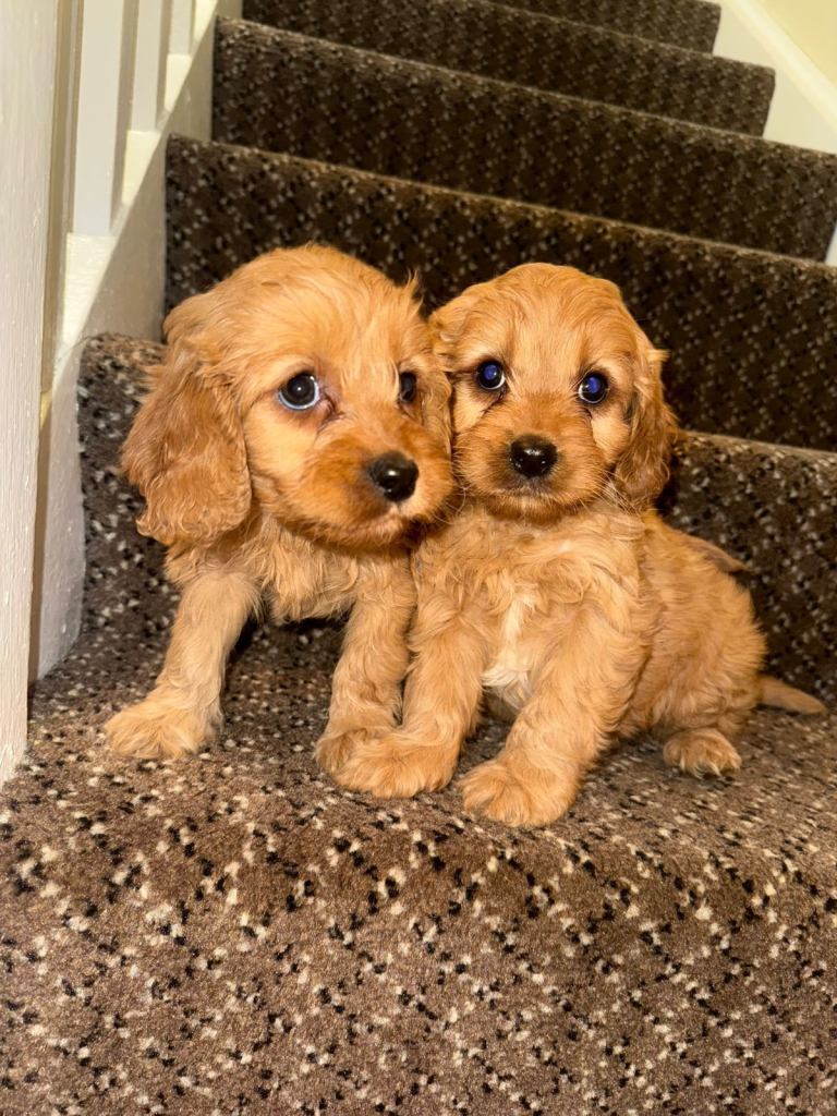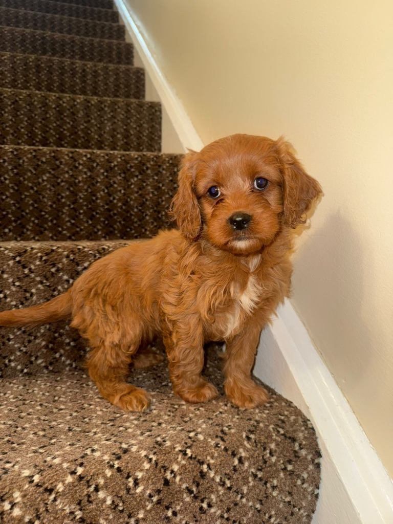 Cavapoo bundles of joy, born on 25th November! 😊 These adorable puppies are a delightful mix of Cavalier King Charles Spaniel and Miniature Poodle, inheriting the best traits from both parents. Their mother, Penny, is a loving, loyal, and an excellent mum - this is her first litter! These little darlings will only be small, and they're stealing hearts with their apricot and red-coloured coats.
