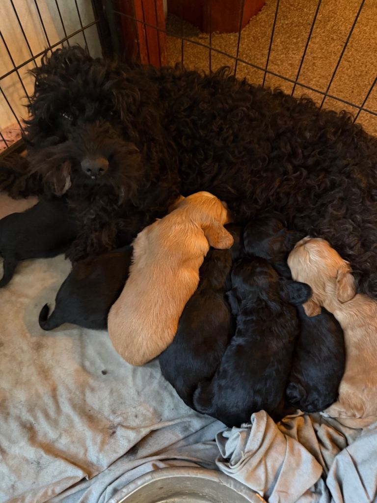 She has birthed 7 puppies, all male, 2 of which are Apricot and 5 black. Born 12thDecember and ready for their new homes by the 6th of February having been weaned, trained to do their business on pads/paper away from their beds, vaccinated and microchipped along with up to date flea treatment completed. They’ll also leave with a blanket that smells like mum and litter to make the transition that bit easier.
