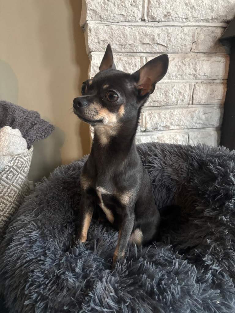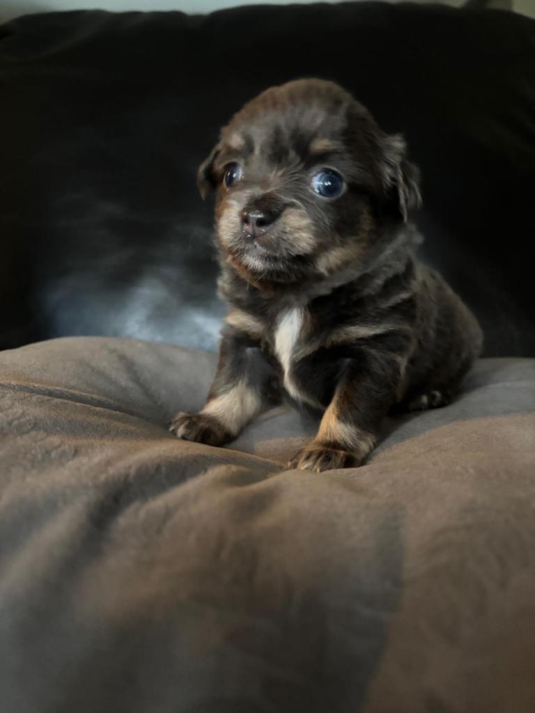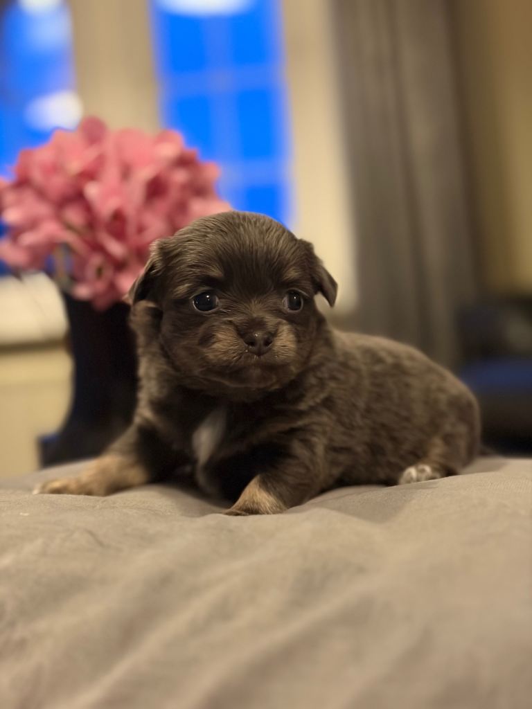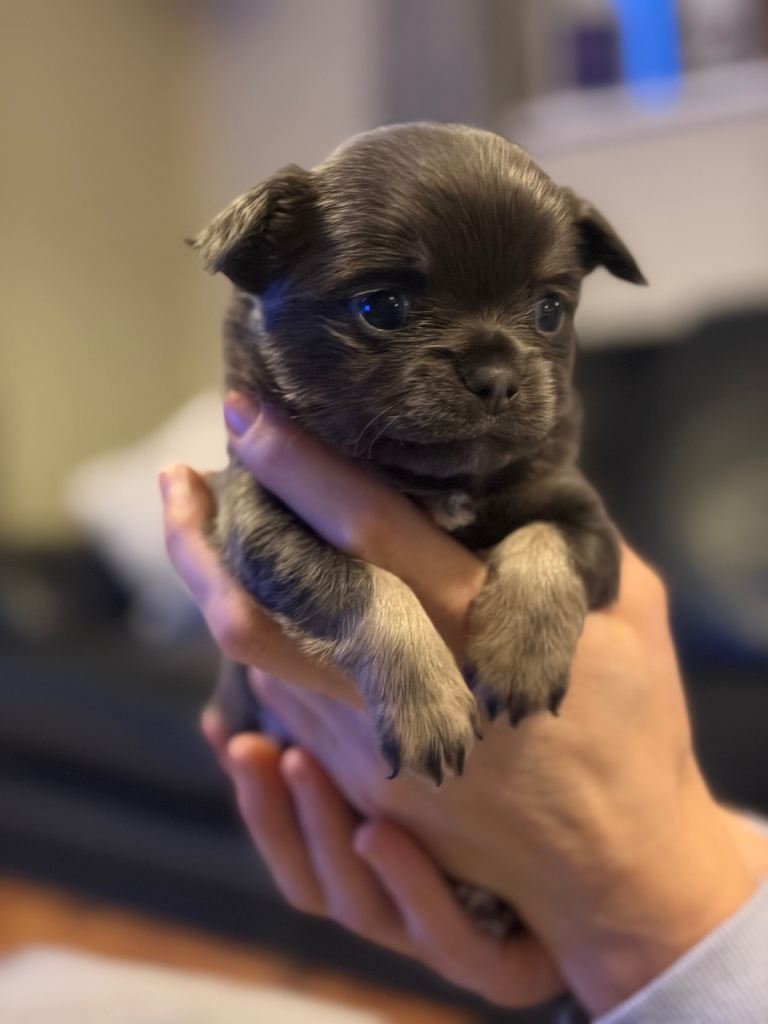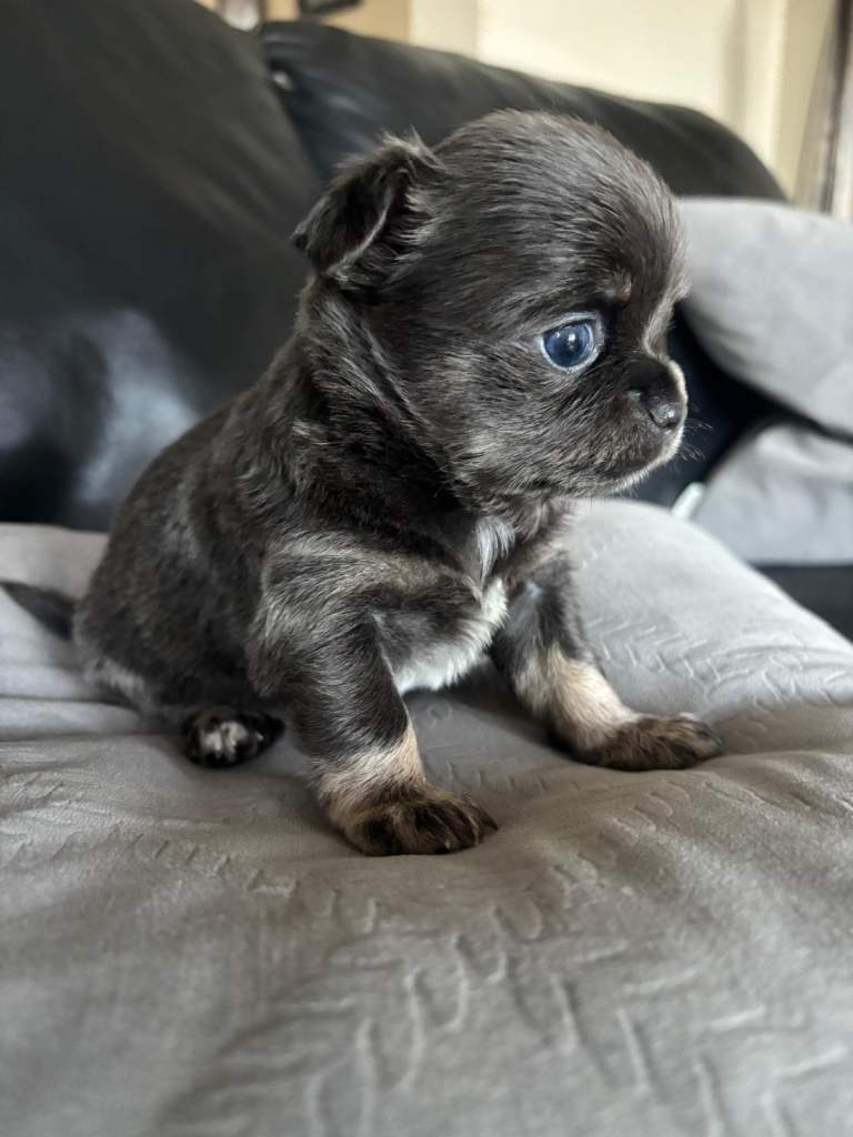 Mum is super affectionate and loved member of our family. She’s a great company, loves cuddles and play. She is small 2.5kg short coat blue tricolour Chihuahua.