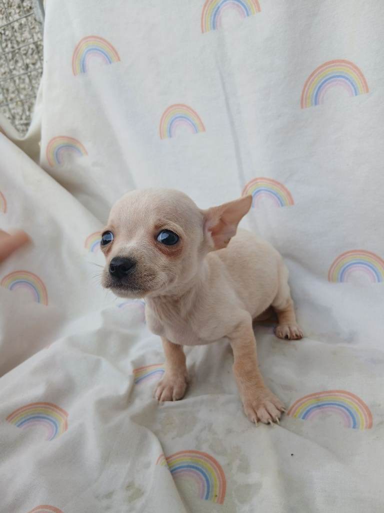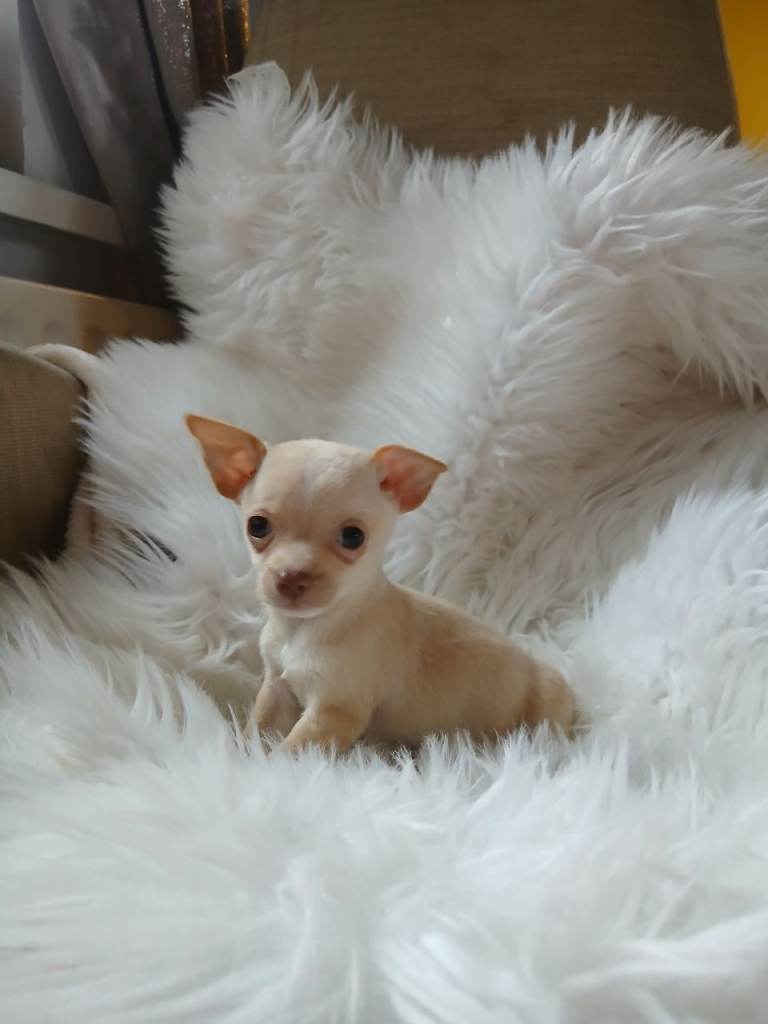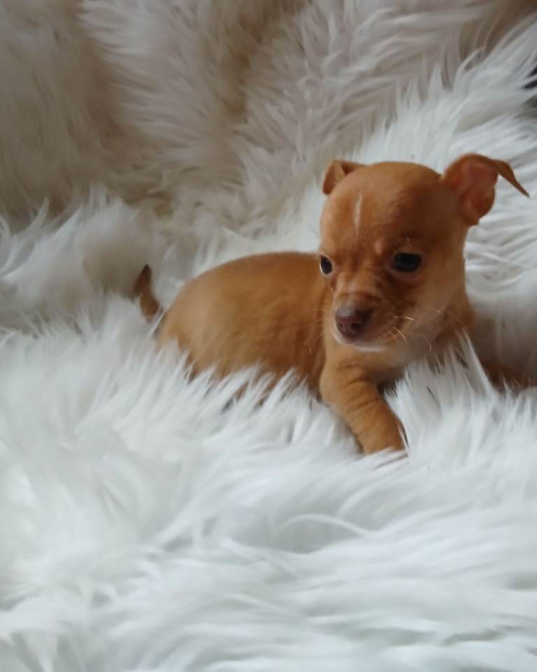 Chihuahua puppies ready to leave both parents can be seen . Vaccinated and wormed