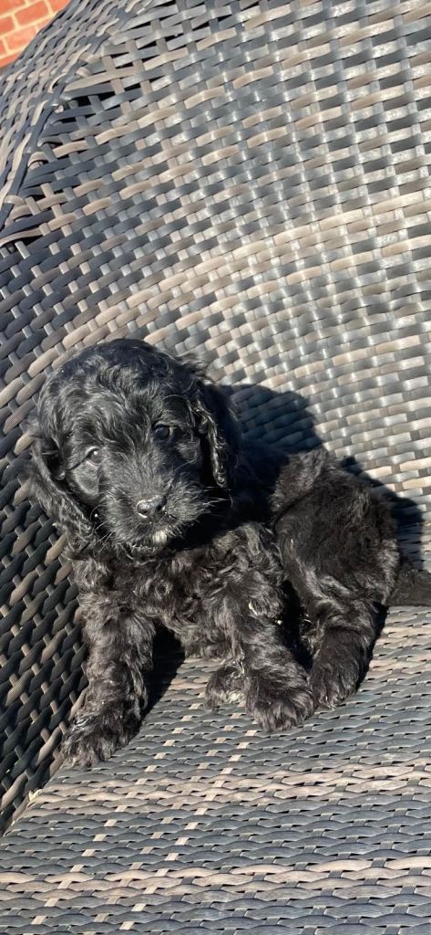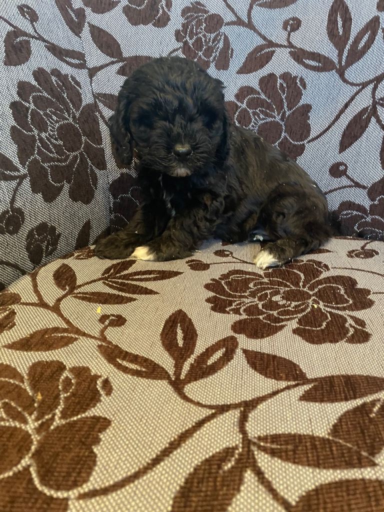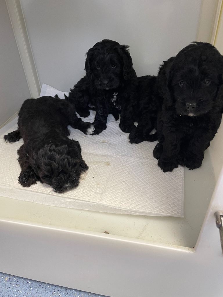 Stunning litter of Cockapoo pups, black, girl/boys, brilliant temperaments, been wormed regularly, flead. Mum is a grey/white cockapoo n dad a PRA clear miniature red poodle