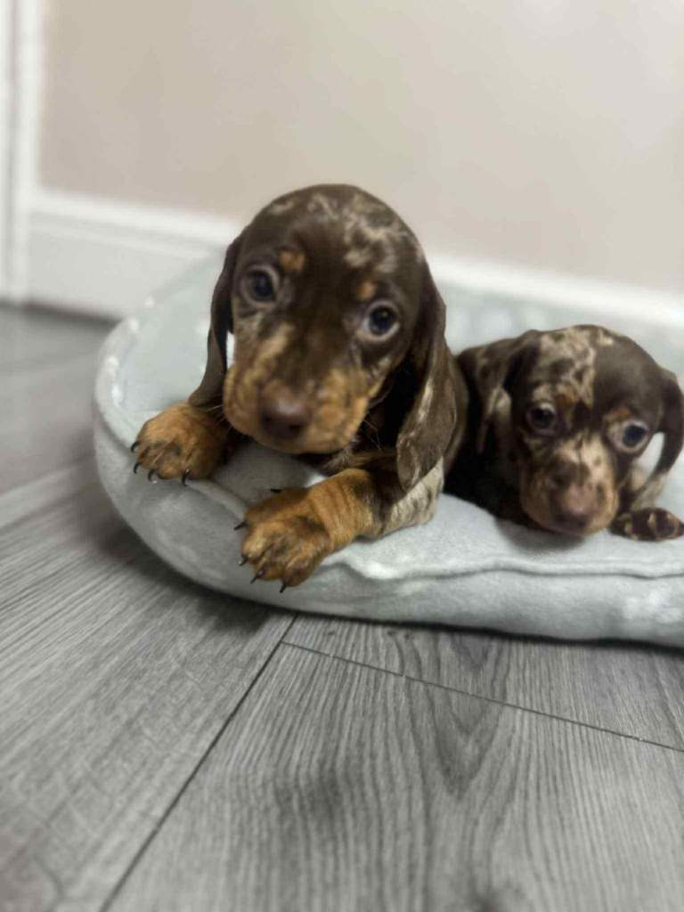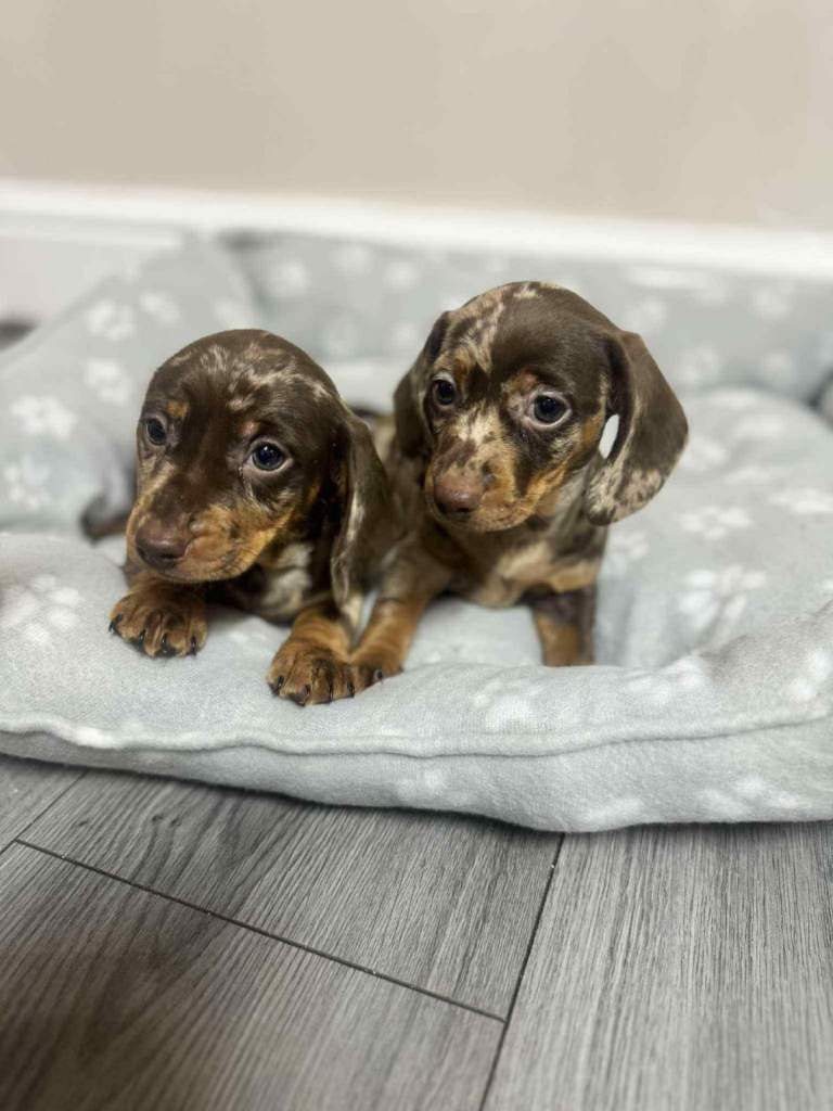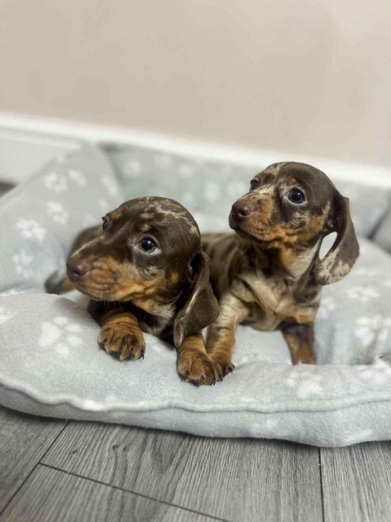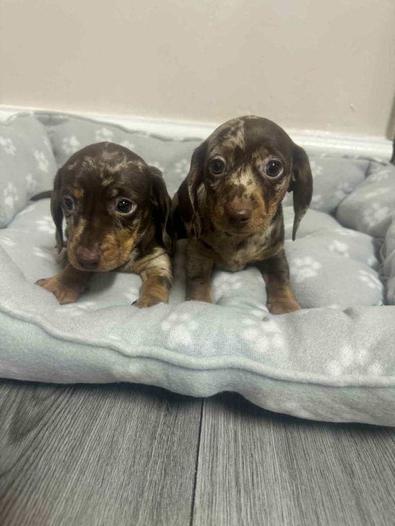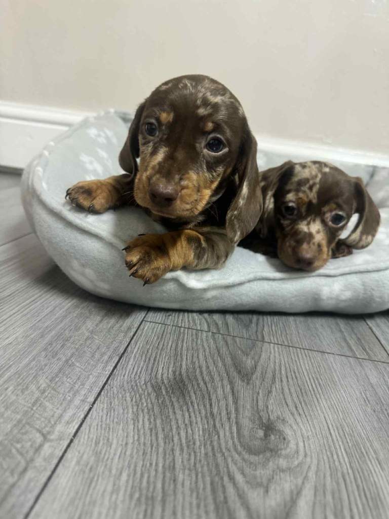 We have dachshund 1 girl and 1 boy chocolate dapple available have vaccinated and microchip health check worming and flea treatments up to date. Mum seen with puppies, redy to leave 5.th ferb.
