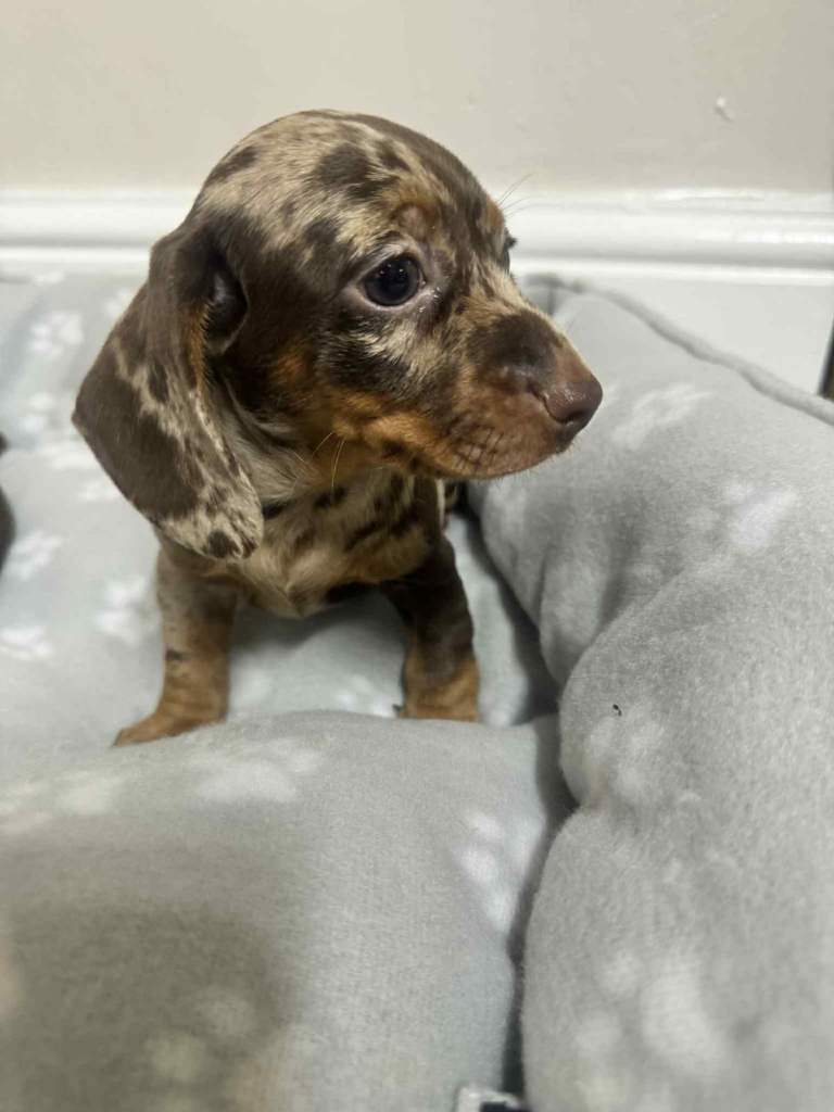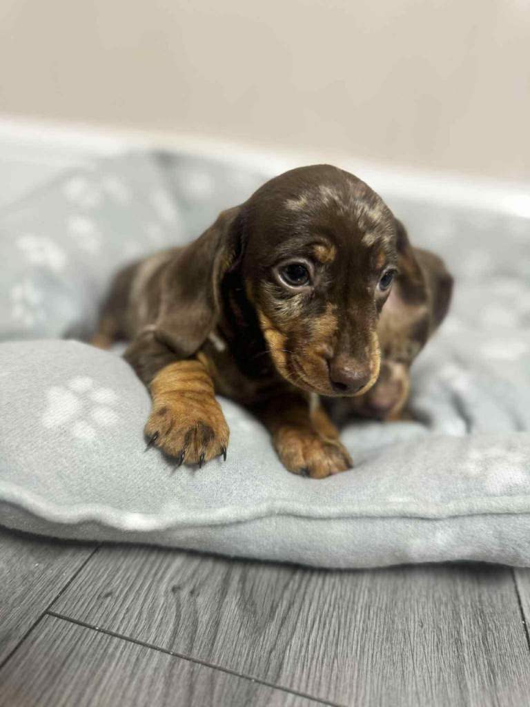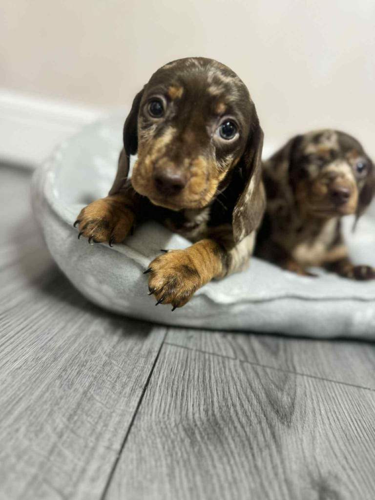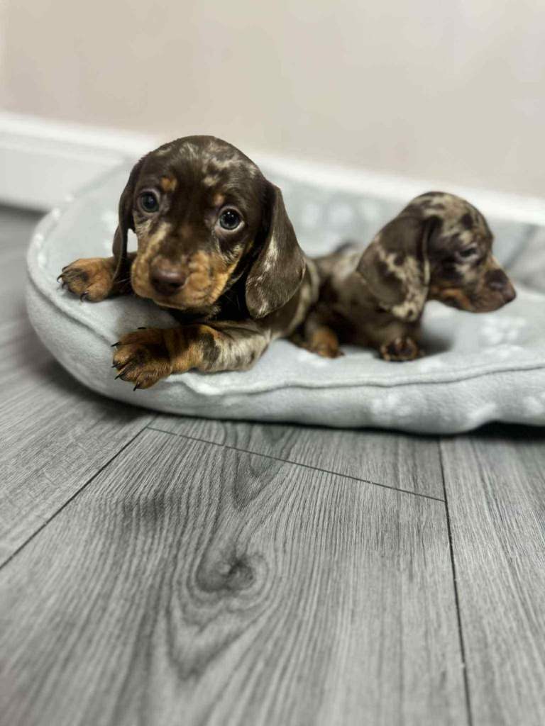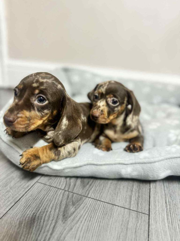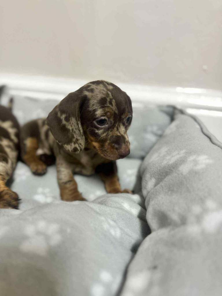 We have dachshund 1 girl and 1 boy chocolate dapple available have vaccinated and microchip health check worming and flea treatments up to date. Mum seen with puppies, redy to leave 5.th ferb.
