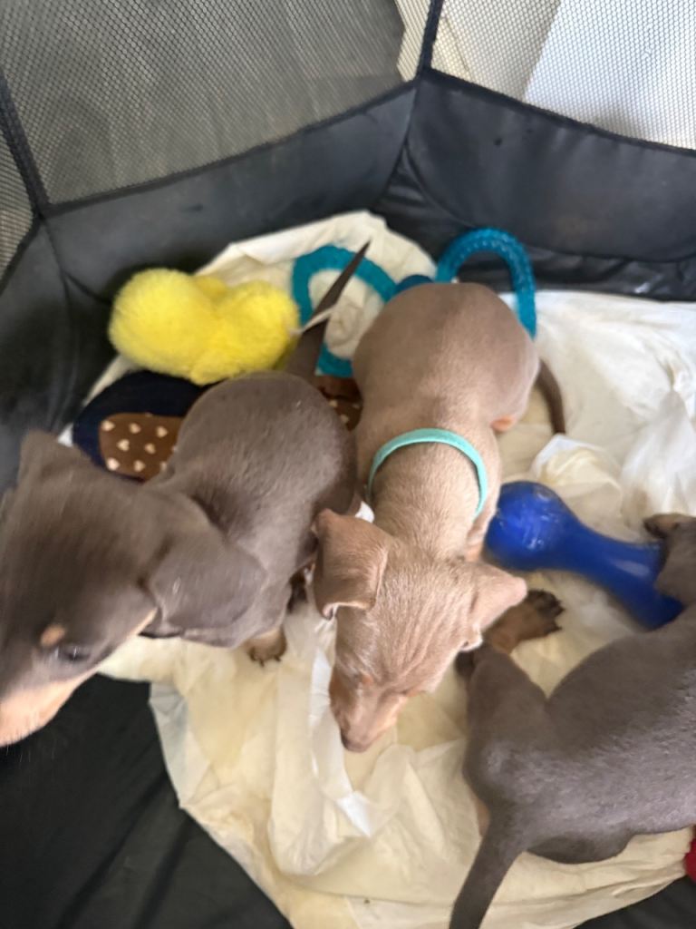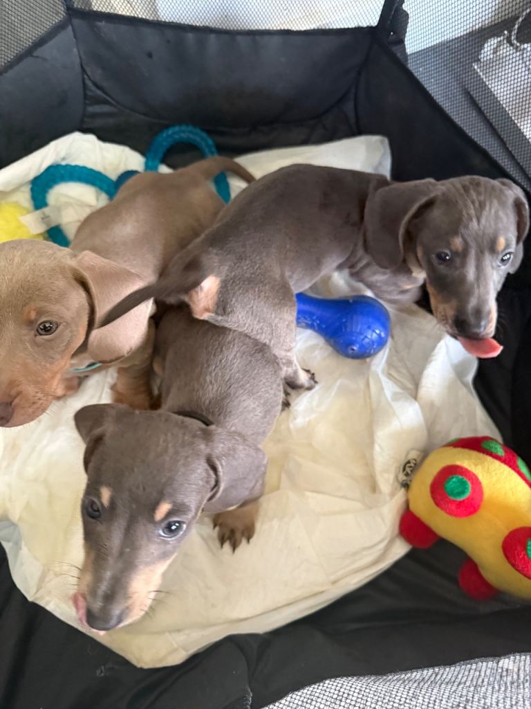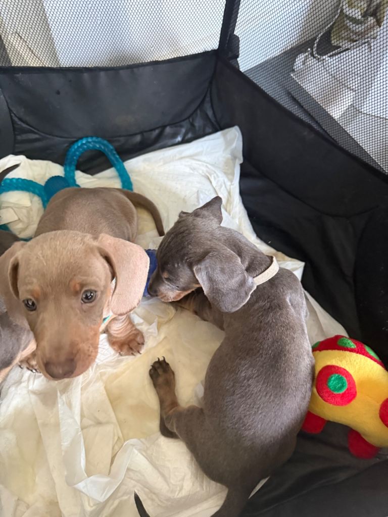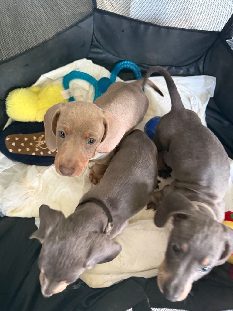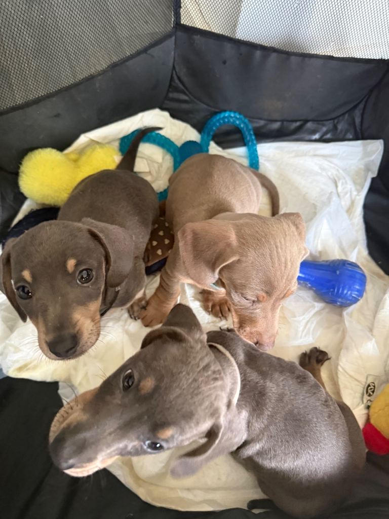 Here we have a lovely litter of Dachshund puppies we have three little boys available looking for their forever home they have had their first vaccination and microchip along with the chick viewings are welcome and they are ready to leave now