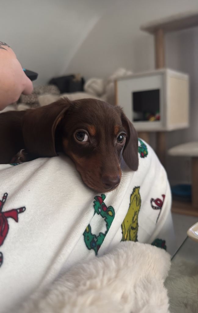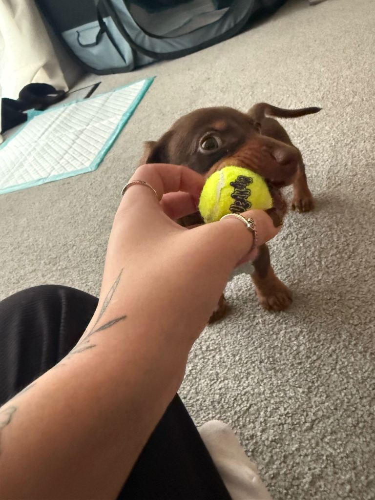 This beautiful pup is looking for his forever home. Unfortunately due to unforeseen circumstances with my personal life I’m having to sell him💔. I’m absolutely gutted about this I would love him to go to a loving home. He always loves a cuddle with you every playful. He has been microchipped and has had his 1st vaccination ( have all the paper work for that). I originally picked this pup up on 21st dec 2025 so can’t show him with mum and dad. But I can assure you when I got him he was with mum and dad in a Loving cleaning home. Also will leave with his favourite toy and blanket. I have all the puppy essentials aswell like