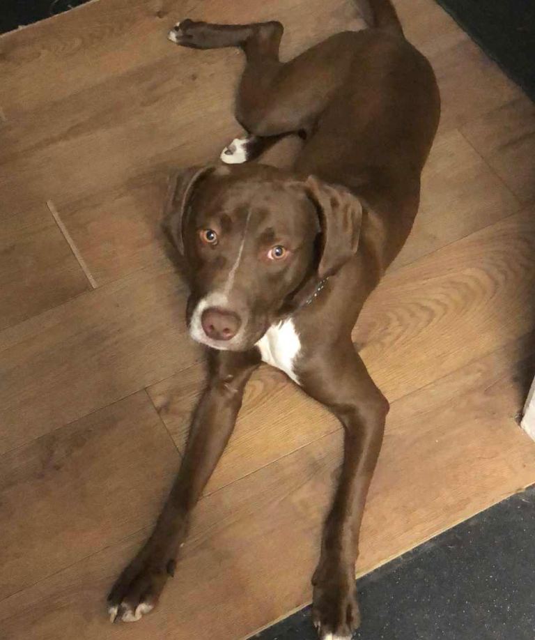 Milo is a one year old, Chocolate brown Dalmatian x staff.