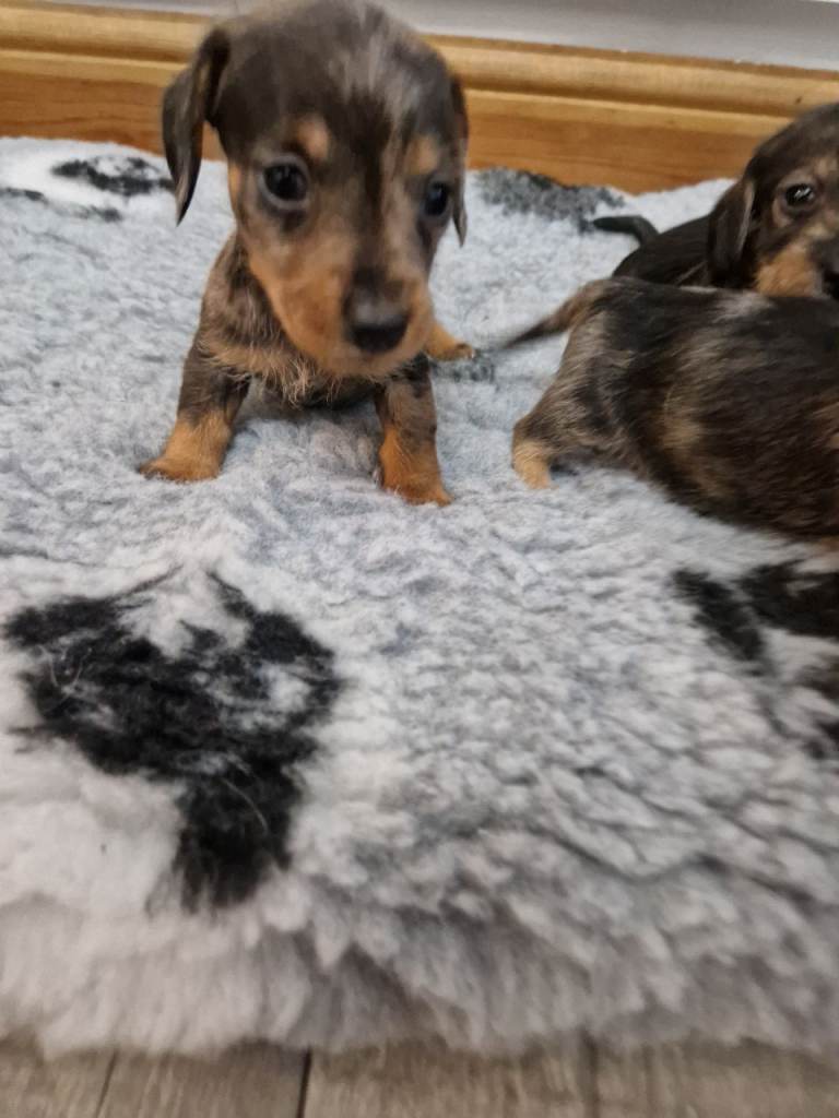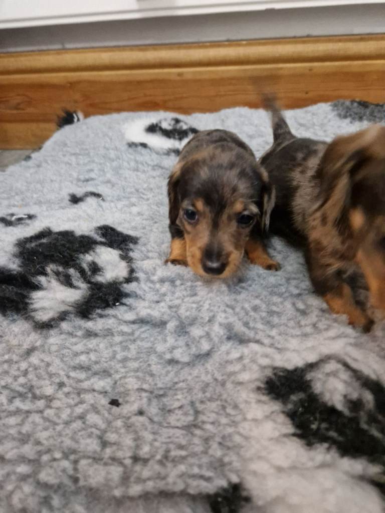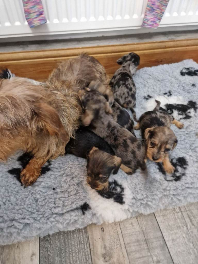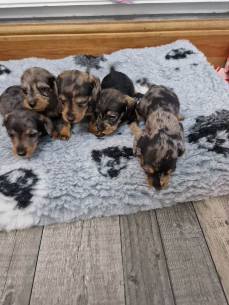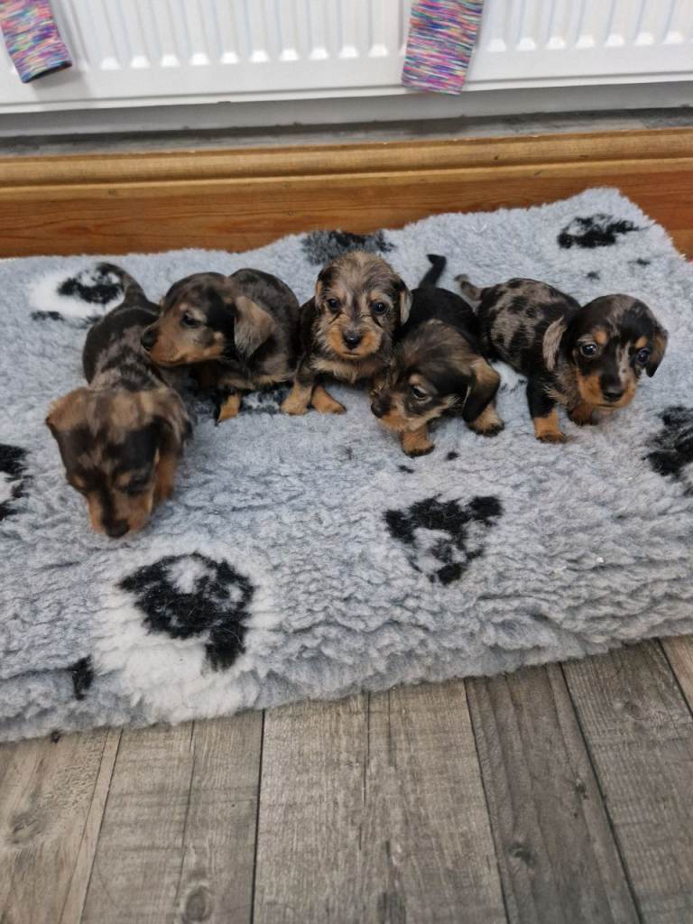 5 wirehaired daschund pups 3 chocolate dapple females a chocolate dapple boy and a wild boar girl pups are absolutely adorable pups are brought up in busy household around children and are well socialized dam and sire are very loving and well natured mother is dapple sire is wildboar pups are wormed every 2weeks and will be chipped ready for leaving