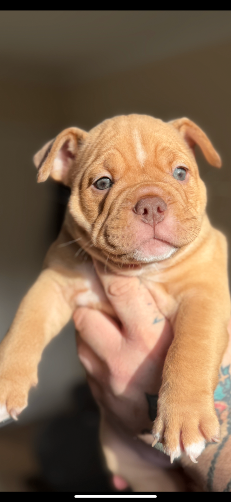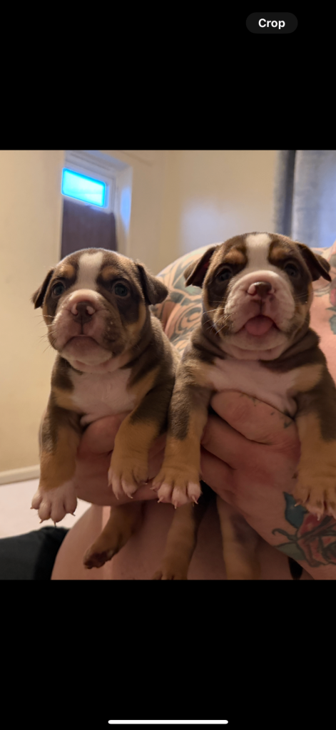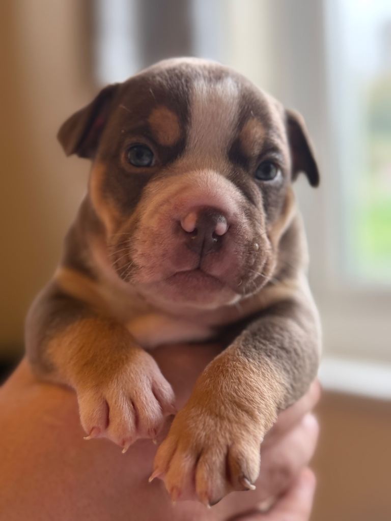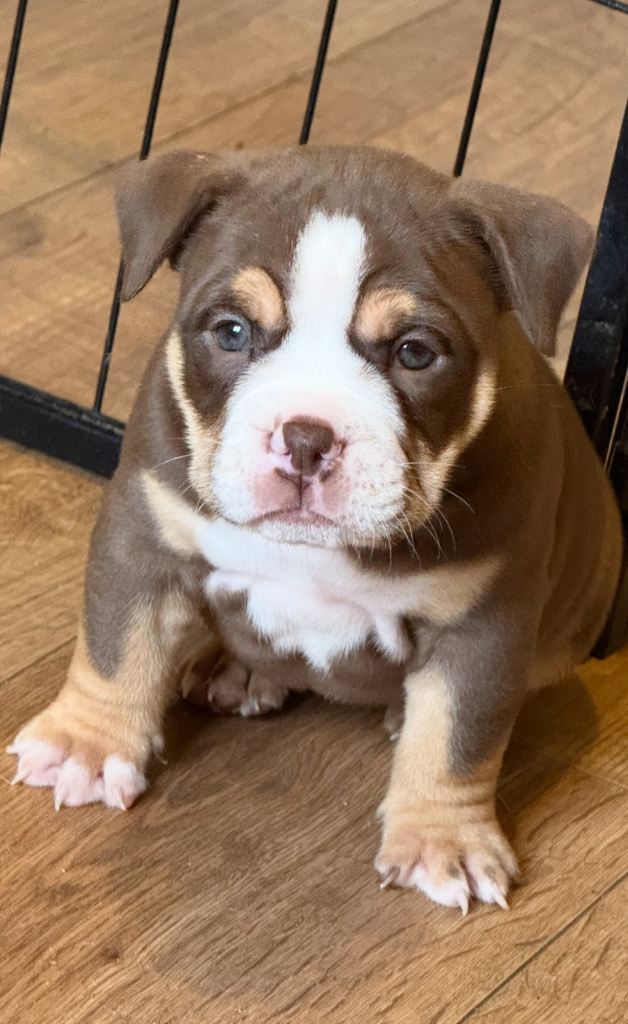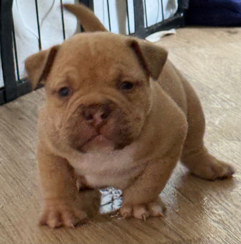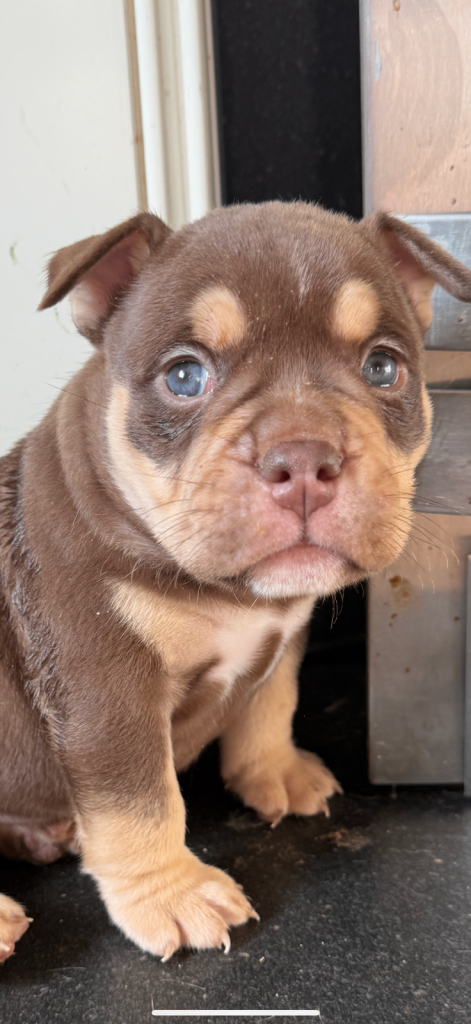 MEGA PRICE DROP! We have an outstanding chunky litter of 7 beautiful puppies!!! 5 girls & 2 boys. Mum is a KC registered English bulldog with top quality bloodlines chocolate tri and dad is imported from Romania American pocket bully abkc registered with champion bloodlines champagne colour. Both mum and dad are family pets so can be seen with puppy's on viewings . These pups are very intelligent already pad trained, puppies have been well socialised in a family environment around children from young ages too! These will make the best family pets… they will come with