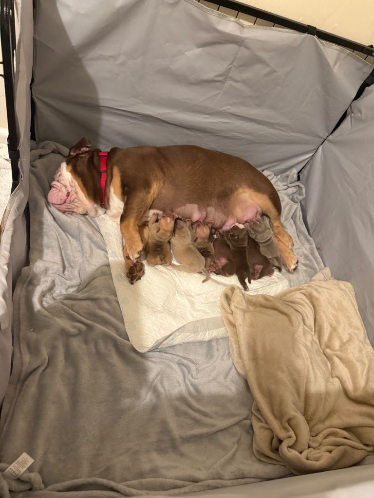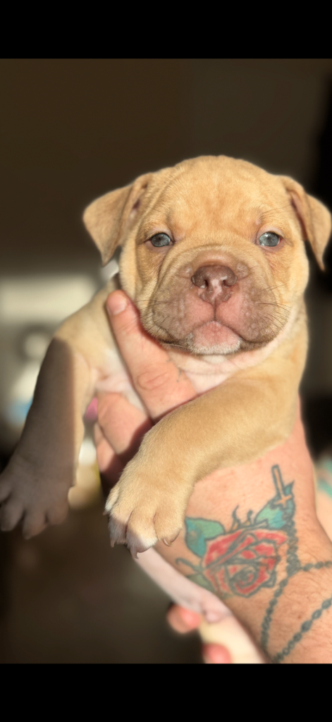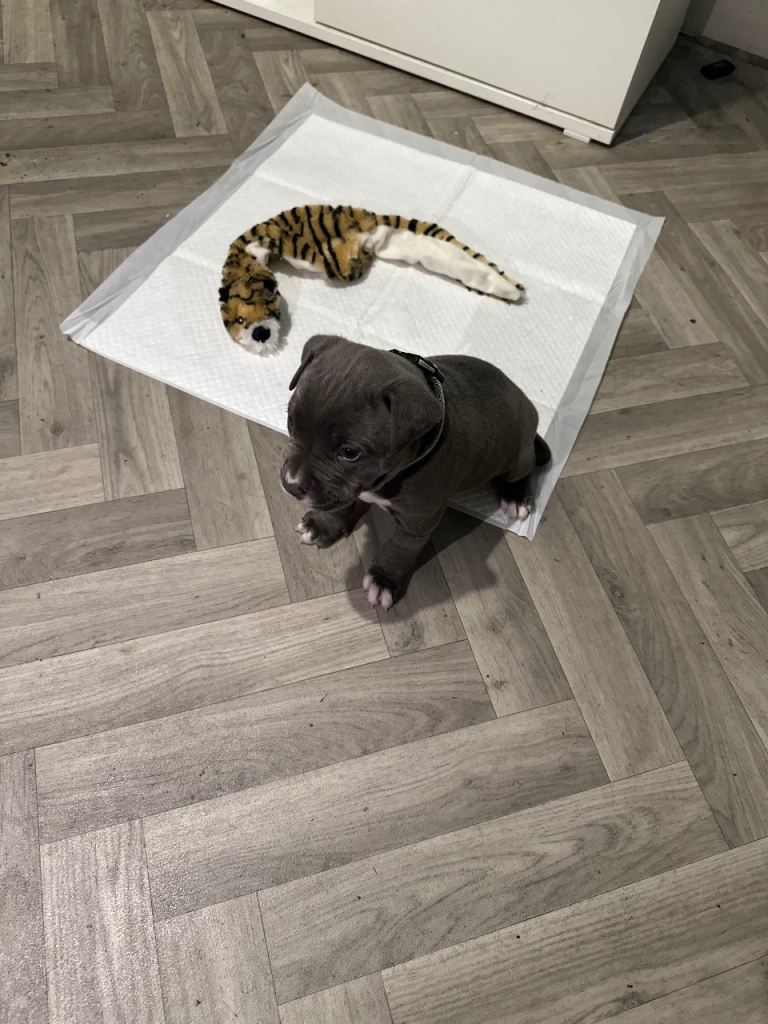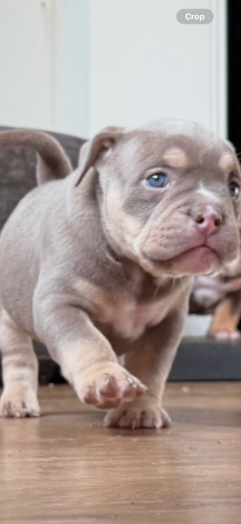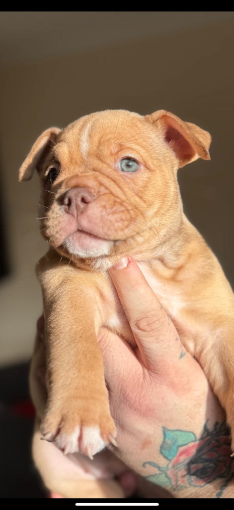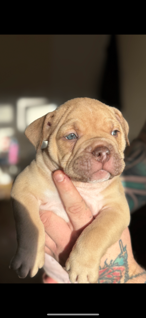 MEGA PRICE DROP! We have an outstanding chunky litter of 7 beautiful puppies!!! 5 girls & 2 boys. Mum is a KC registered English bulldog with top quality bloodlines chocolate tri and dad is imported from Romania American pocket bully abkc registered with champion bloodlines champagne colour. Both mum and dad are family pets so can be seen with puppy's on viewings . These pups are very intelligent already pad trained, puppies have been well socialised in a family environment around children from young ages too! These will make the best family pets… they will come with