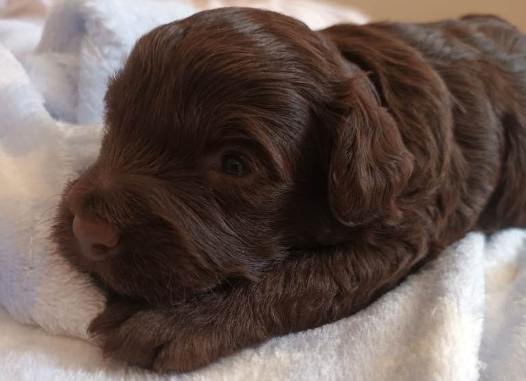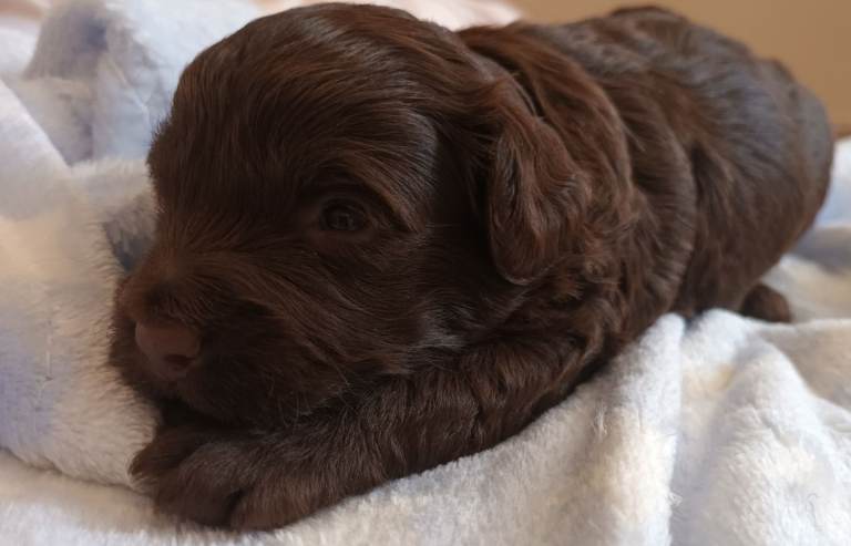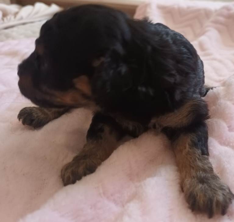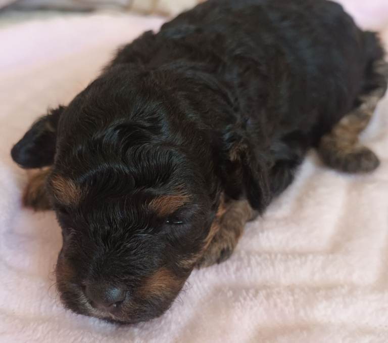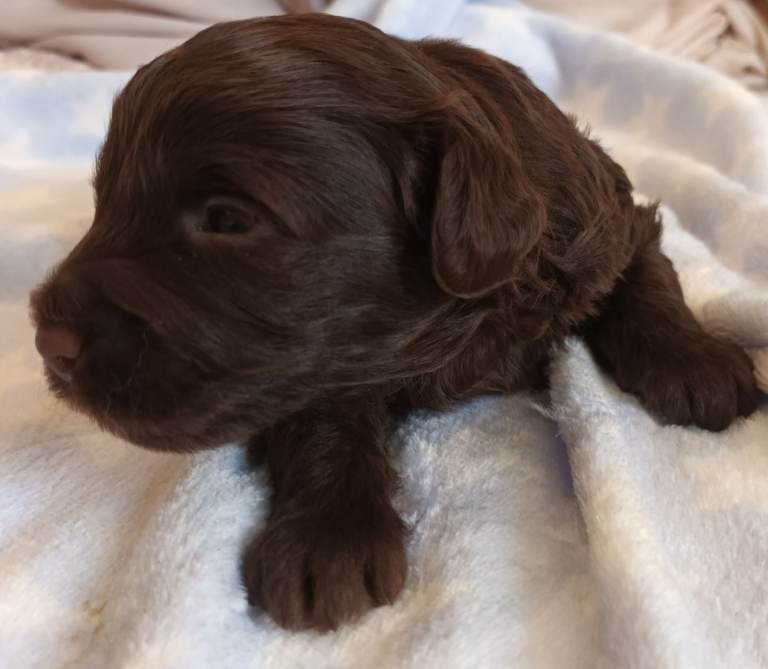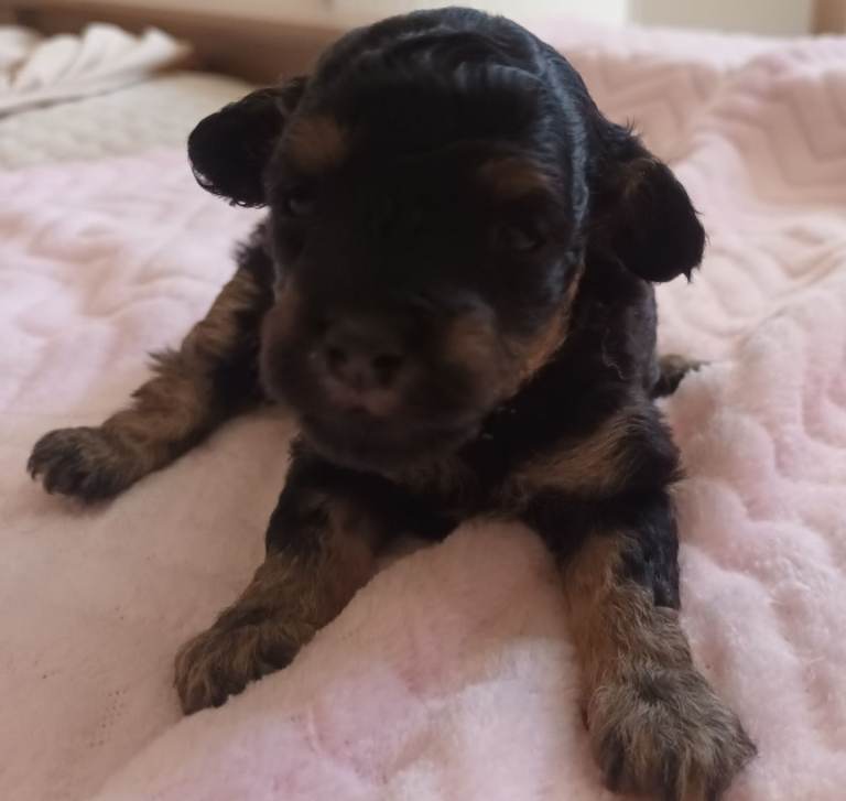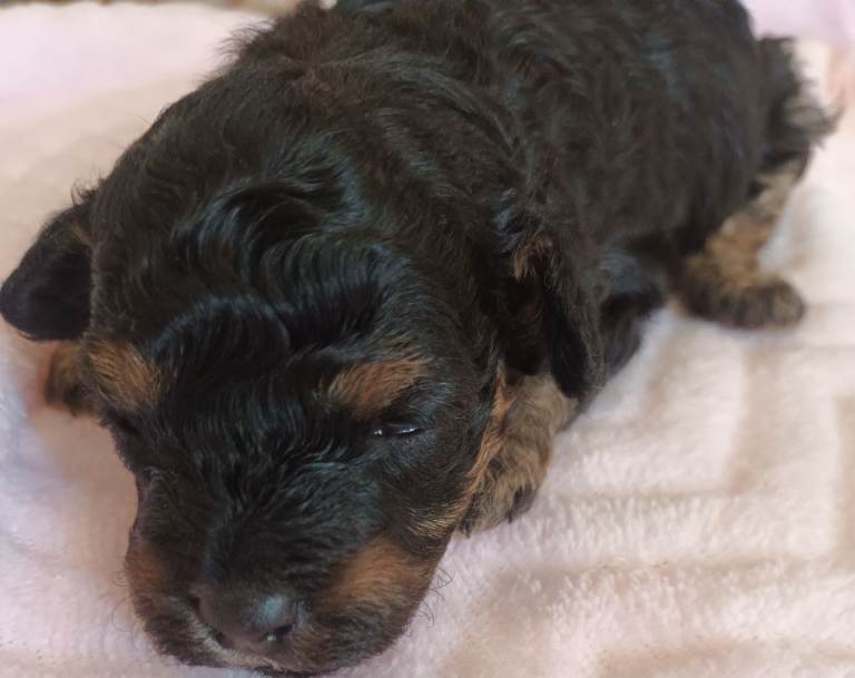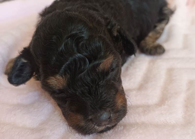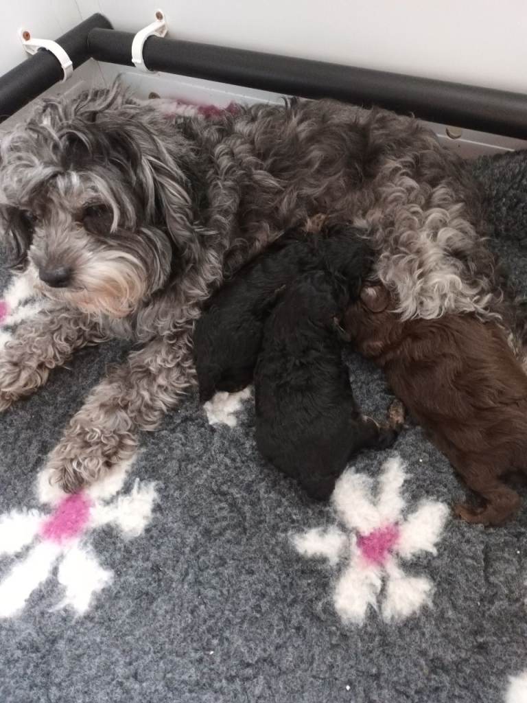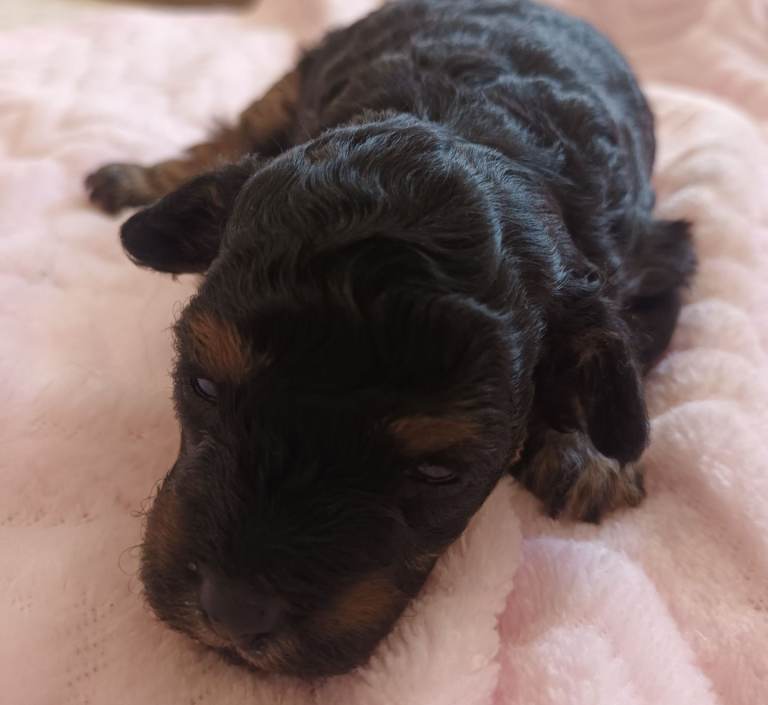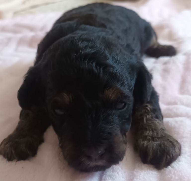 Peppa our beautiful F1b Cavapoo gave birth to 3 adorable puppies on 23rd of March 2 blk and tan girls and 1 chocolate boy . Mum is Merle F1b Cavapoo and Dad is Kc reg toy poodle dad is fully health tested and DNA tested. All are being raised in our family home so very hygienically clean. They will be extensively health checked this means they will have their own individual health certificate also 1st vaccination plus fully wormed and micro chipped before leaving for their new responsible family homes on the 18th of May. A non refundable deposit of £300 will secure the puppy of your choice please feel free to contact me for any further details. Personal viewings prered but not essential also face time. Thank you for taking the time to read my advert.