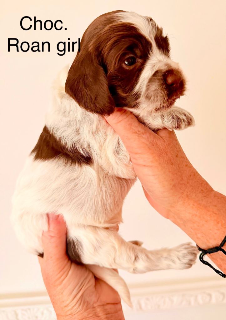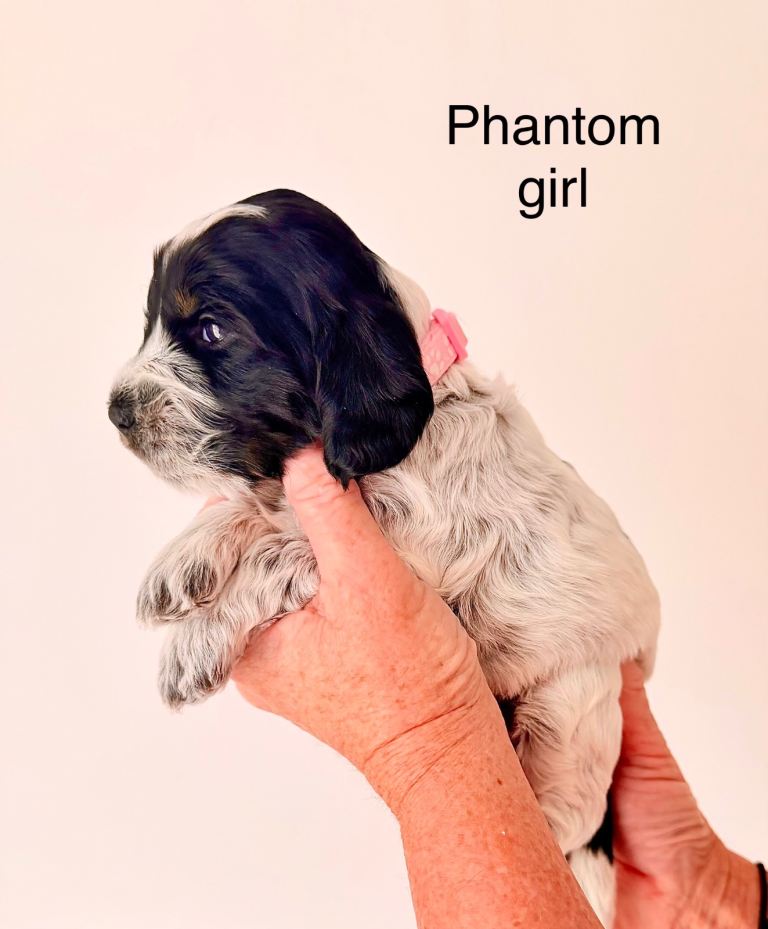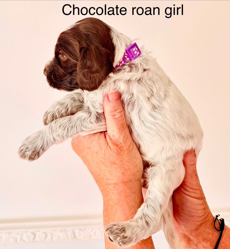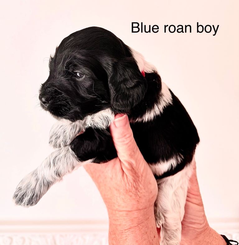 Our amazing girl Bailey has given birth to 11 gorgeous healthy F1 cockapoo pups born 14th February. We have blue roans, chocolate roans and tricolour phantoms. These colours are not linked with the merle coat colour which is also not associated with poodles or cocker spaniel breeds. To breed a merle cockapoo another colour has been added into the parents' linage. Merle is linked with increased health risks please do your homework. Pictures of Baileys previous litter is in this advert so you can get a general idea of what roan pattern will look like in adulthood. We have 3?boys and 5 girls available ( 3 pups reserved) Female pups will be on average 7 Kg boys around 12 Kg at adulthood. Mum Bailey is a KC show type cocker spaniel and will be available to view with her pups. Dad Jiggy is a KC miniature chocolate particoloured poodle; we have photographs of him in owners information pack to keep forever. It is essential that we find the best home for all our puppies. So with this in mind, we will ask questions when you come to visit us. To guarantee the best match, we ask all potential owners to do their research on the breed prior to contacting us.