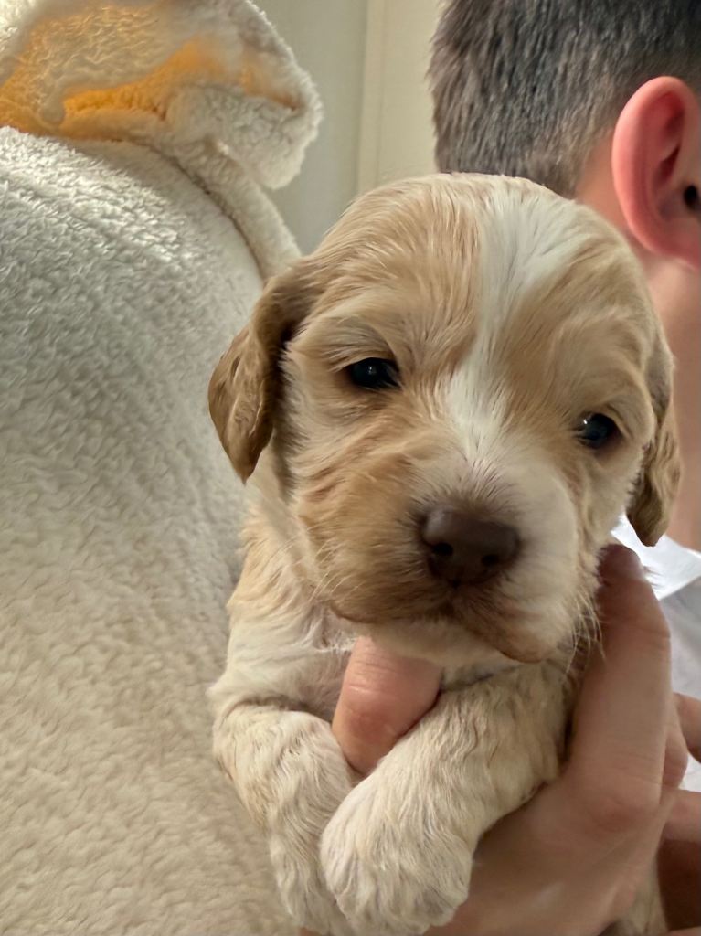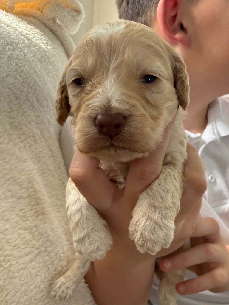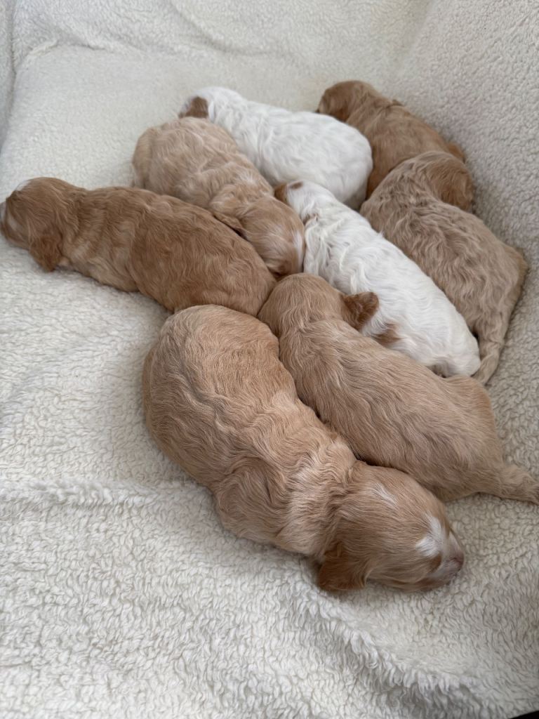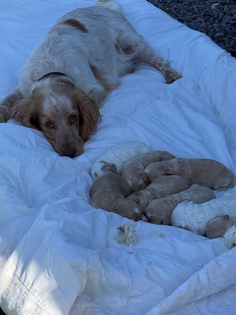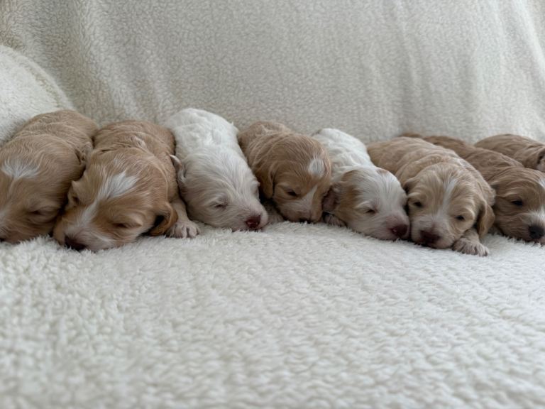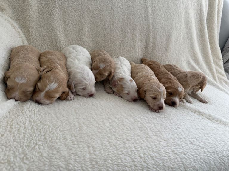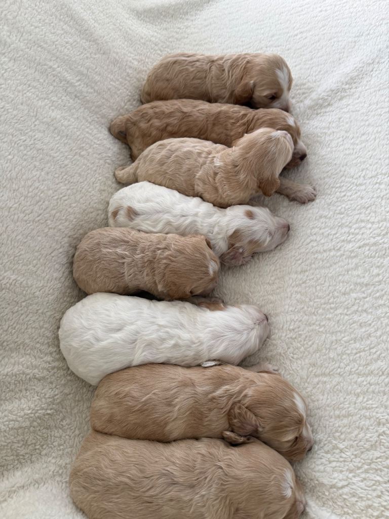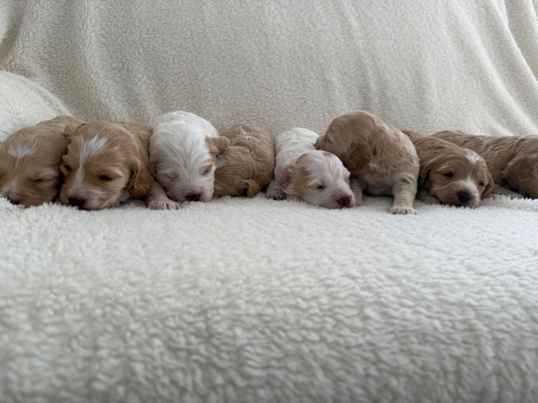 Hi there my beautiful girl Daisy have had a amazing bundle off joys she’s had 8 all together 6 females and 2 males , she’s a show type cocker spaniel and dad is a white poodle miniature,