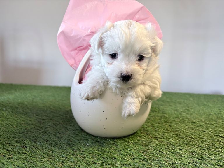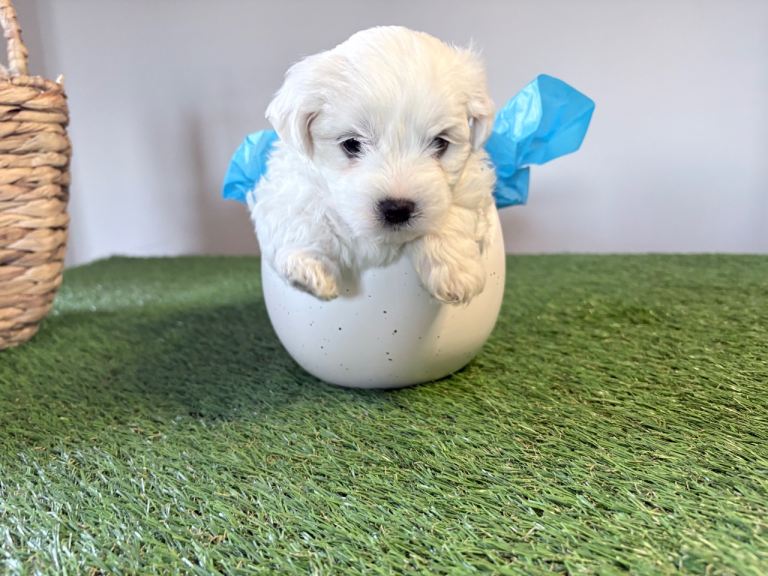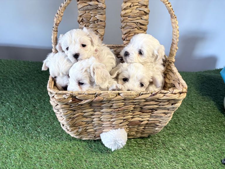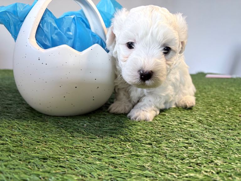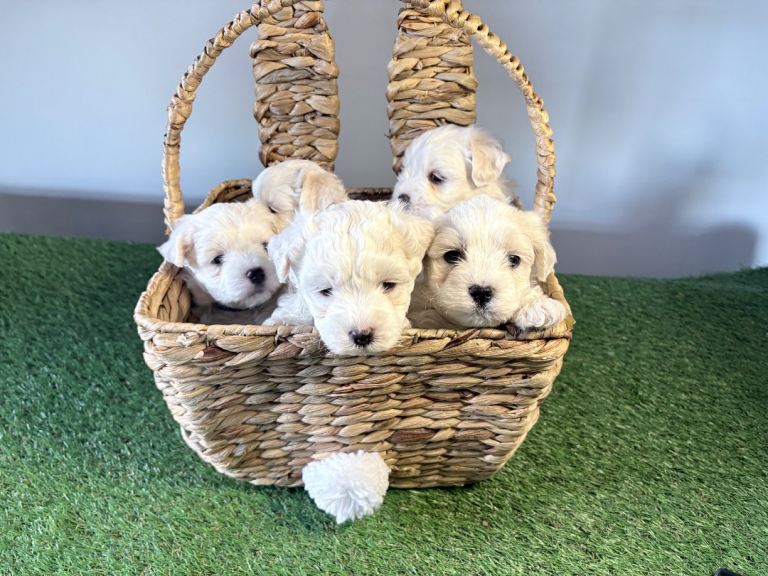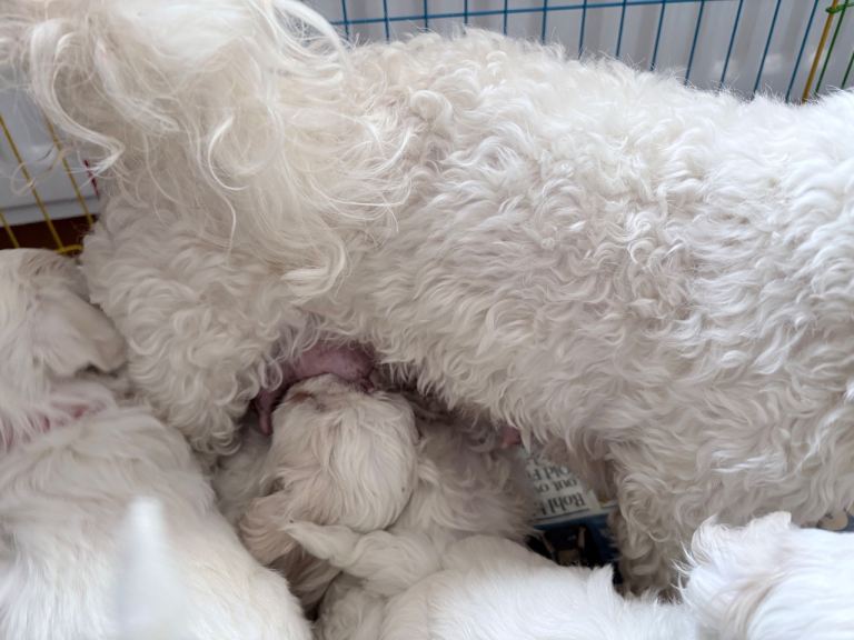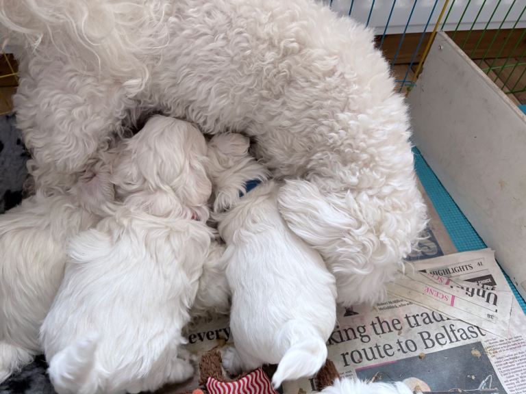 Bookings being taken for beautiful F1 Maltichon puppies. 5 weeks old. Gorgeous little non casting bundles of fluff. Mum is a bichon and dad is a Maltese. Both are much loved family pets.
