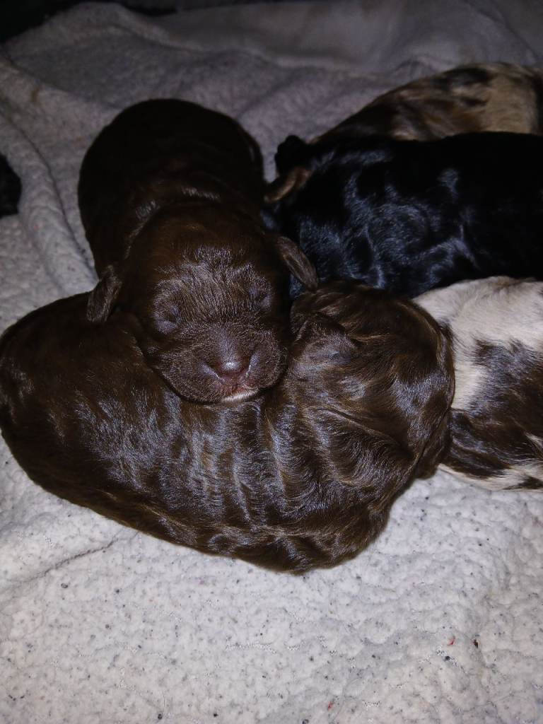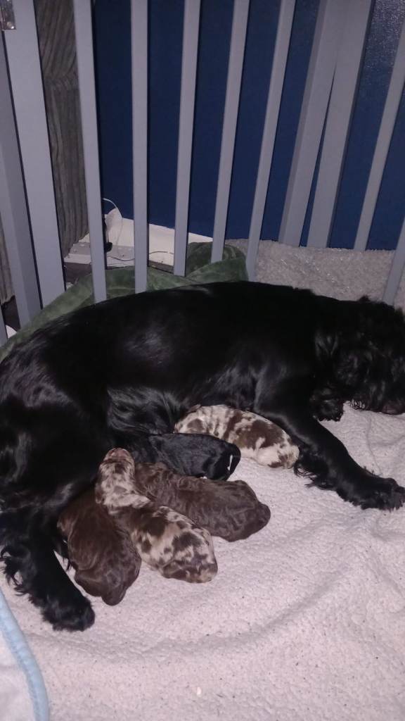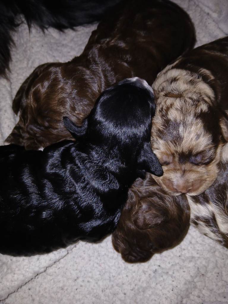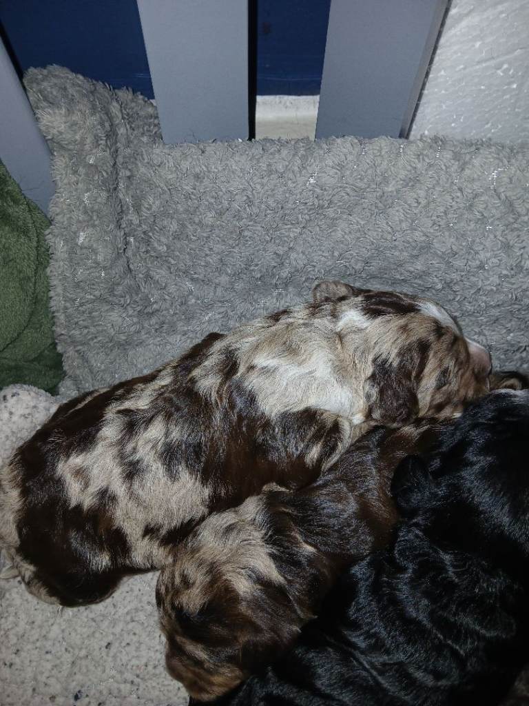 F1 mini cockerpoos born 22nd December these adorable puppies are looking for there loving forever home i have 1 merle female £1400 2 chocolate boys and 1 black girl £1100 each, non refundable deposit of £300 required on your chosen puppy. They will be vet checked, microchipped, flead and wormed on collection and also come with a puppy pack. Mum is a black working cocker spaniel vet checked and dad is a mini merle poodle who has been dna health checked by the kennel club Updates will be sent on request. Serious buyers only thanks for reading, thanks gemma x
