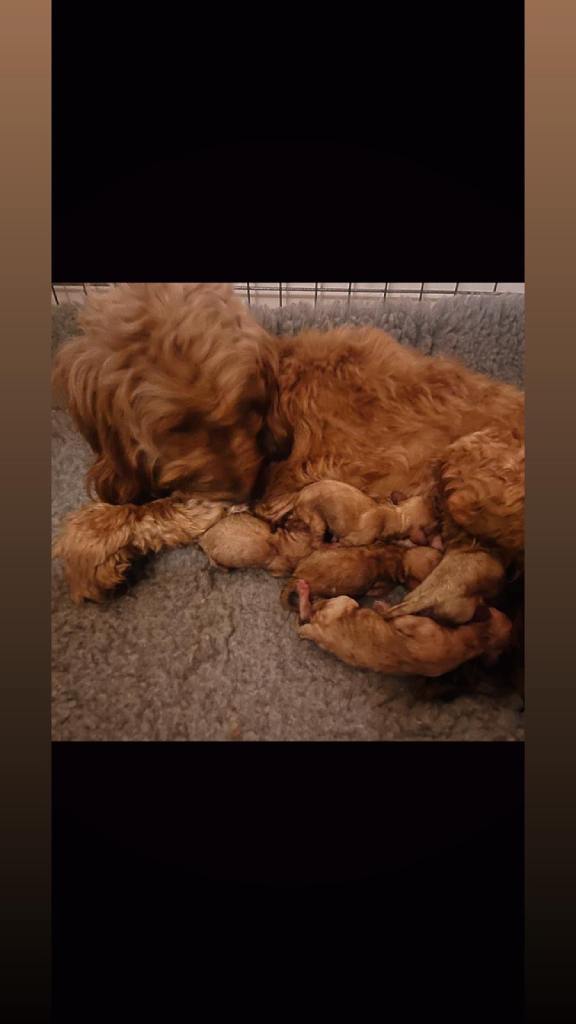 Mum is our much loved family pet and can be met with her pups and also in the last picture. Mum is cockapoo and dad is miniature poodle. Both have great natures and have definitely passed this on to their pups. They have been well socialised and handled by kids and adults. Used to other family pets also and all household noises as they are always in the middle of the chaos!