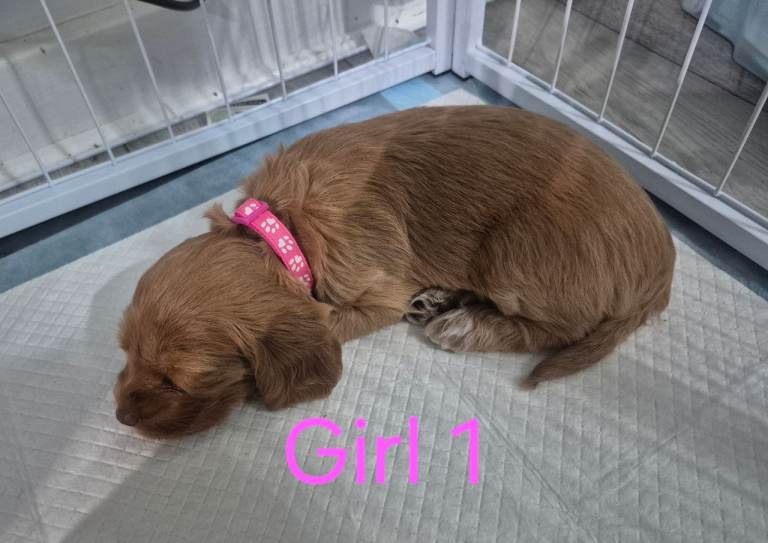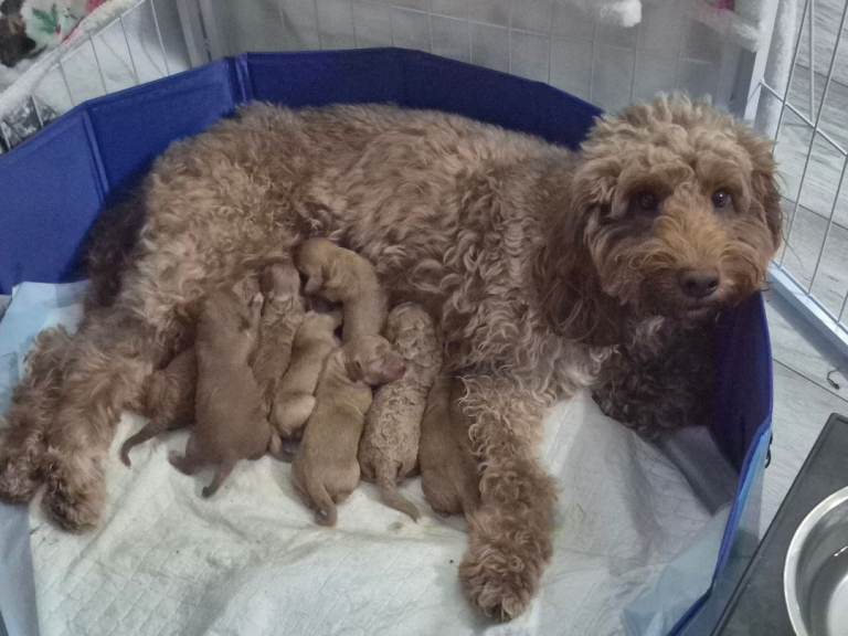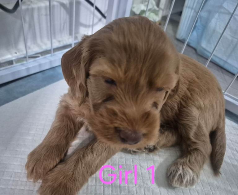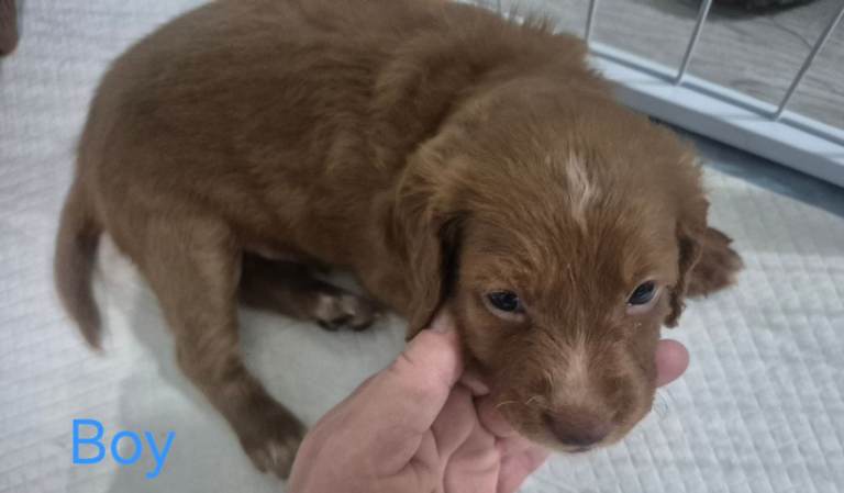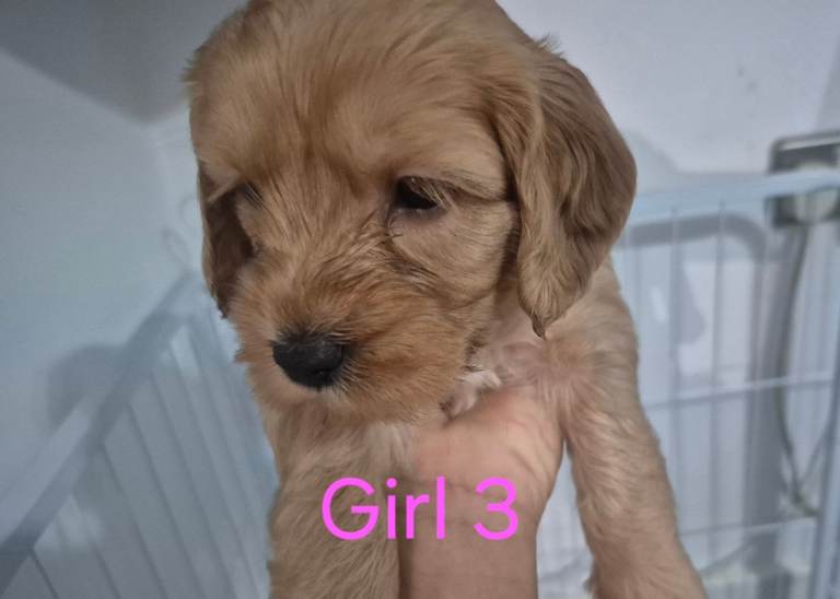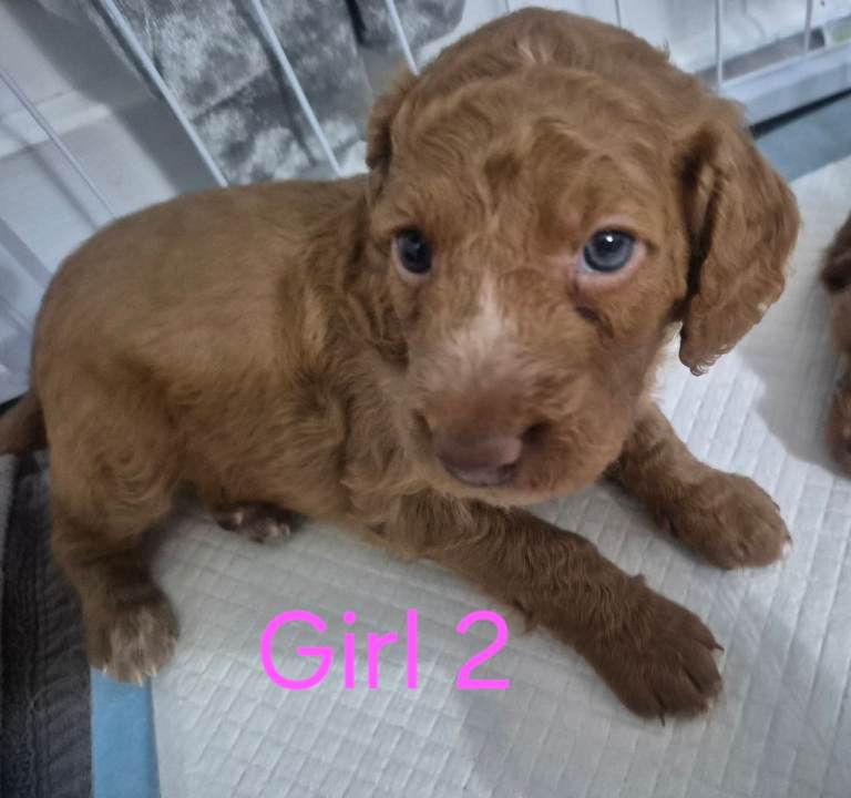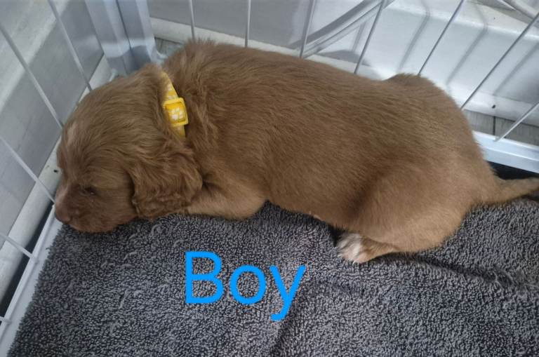 Our lovely Lola has had her 1st litter, 8 adorable bundles of cuteness. We have 1 boy and 3 girls left, looking for their new homes. Lola is a red F1 cockapoo and Dad is the same. Puppies are all well socialised, used to children big and small and all household noises. They will have their 1st vaccination, be wormed and flea treated, and vet checked before leaving us. £250 deposit to secure your puppy.