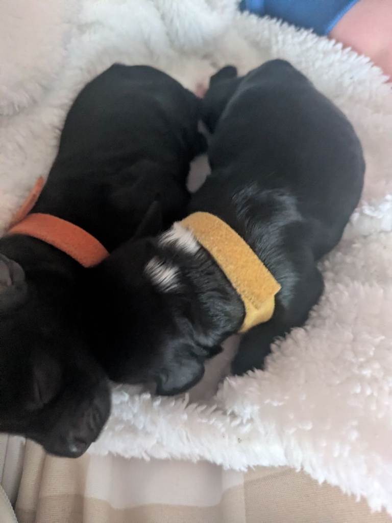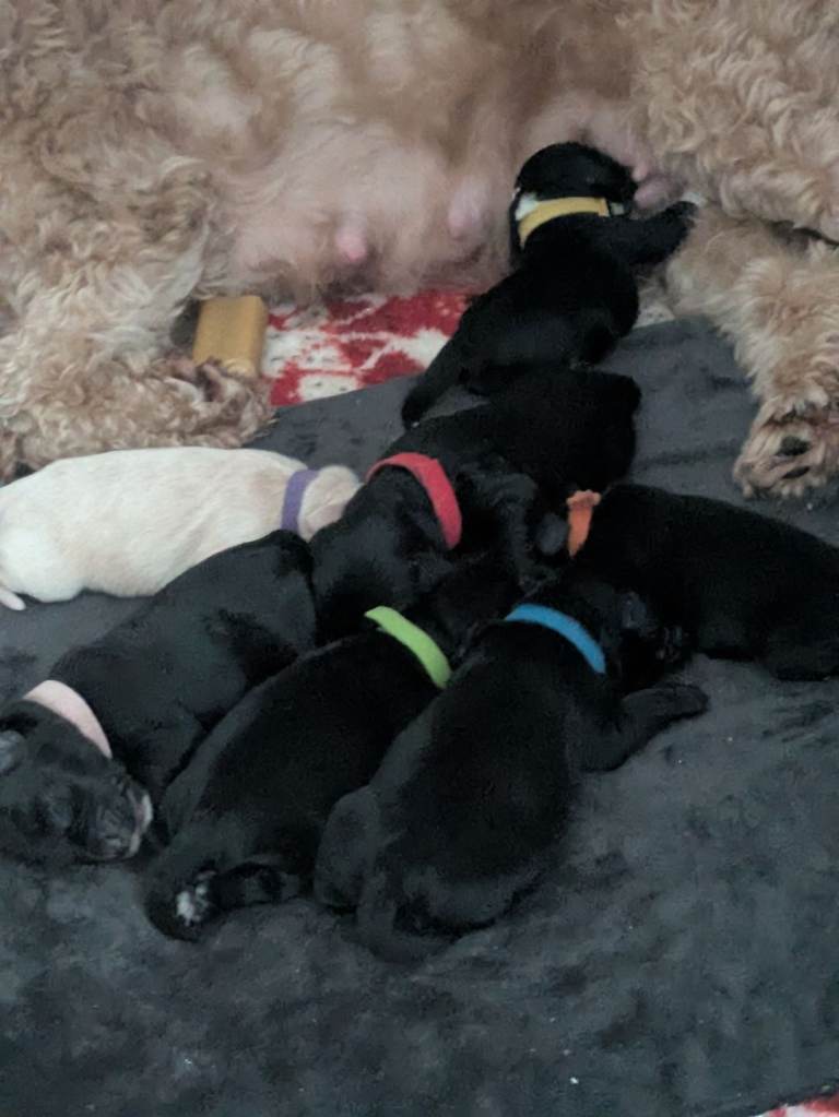 4 females two Black and white pink and yellow collars and 1 predominantly black female green collar . 1 fawn female purple collar