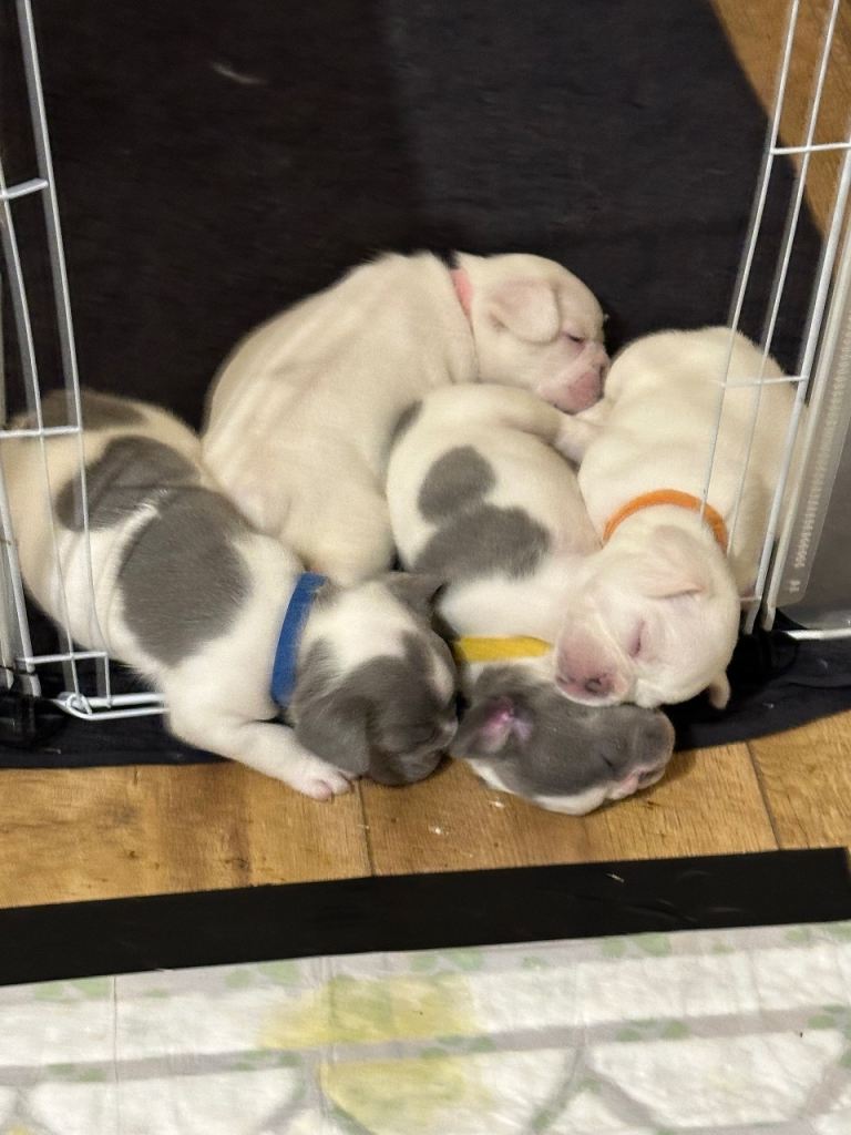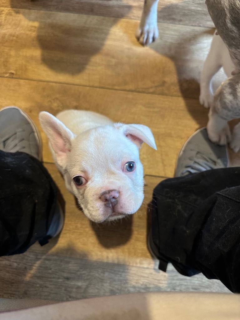 Adorable fluffy French bulldog. White Female, available for forever home Saturday 21st February. Will have first vaccine and will be microchipped and health checked. She is one of a litter of 4. Full of attitude one very playful. Come and meet the whole family until Friday 29th at 2pm then after that only mom dad and this puppy will be here I am asking £1100 with DWKC papers or £800 without papers. I don’t believe the papers are worth the paper they’re written on in my honest opinion.