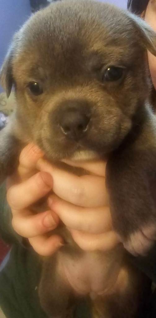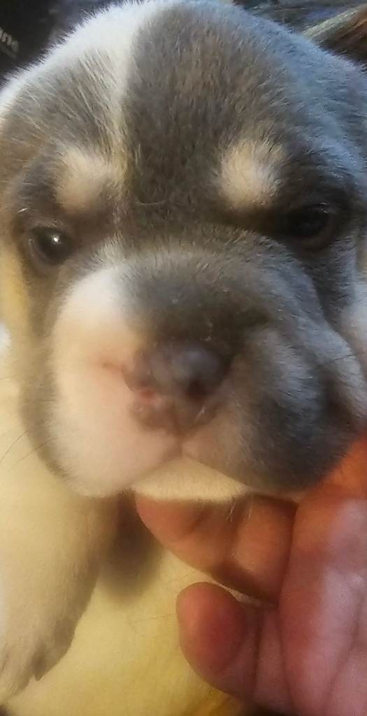 We have 4 girls and 1 boy which had white and black markings on his face . The girl are going for £400 or offers and the 1 boy are £450 and they are 8 weeks and on the 12th of april you can take the pup