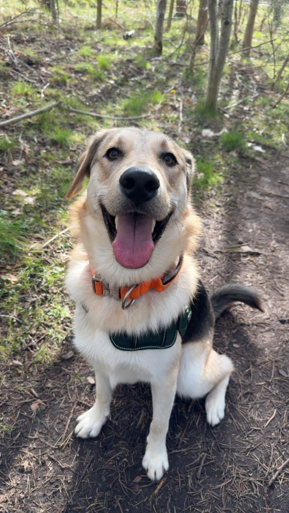 Training & exercise — Recall is good unless distracted by other dogs or people (he wants to say hello!) Walks better on a head collar but does still pull on the lead, with consistent training this can improve. Very outdoorsy and active, he needs daily exercise and mental stimulation. Would suit someone with large dog experience. Could live with another dog (this is preferred, as he’s always lived with one).