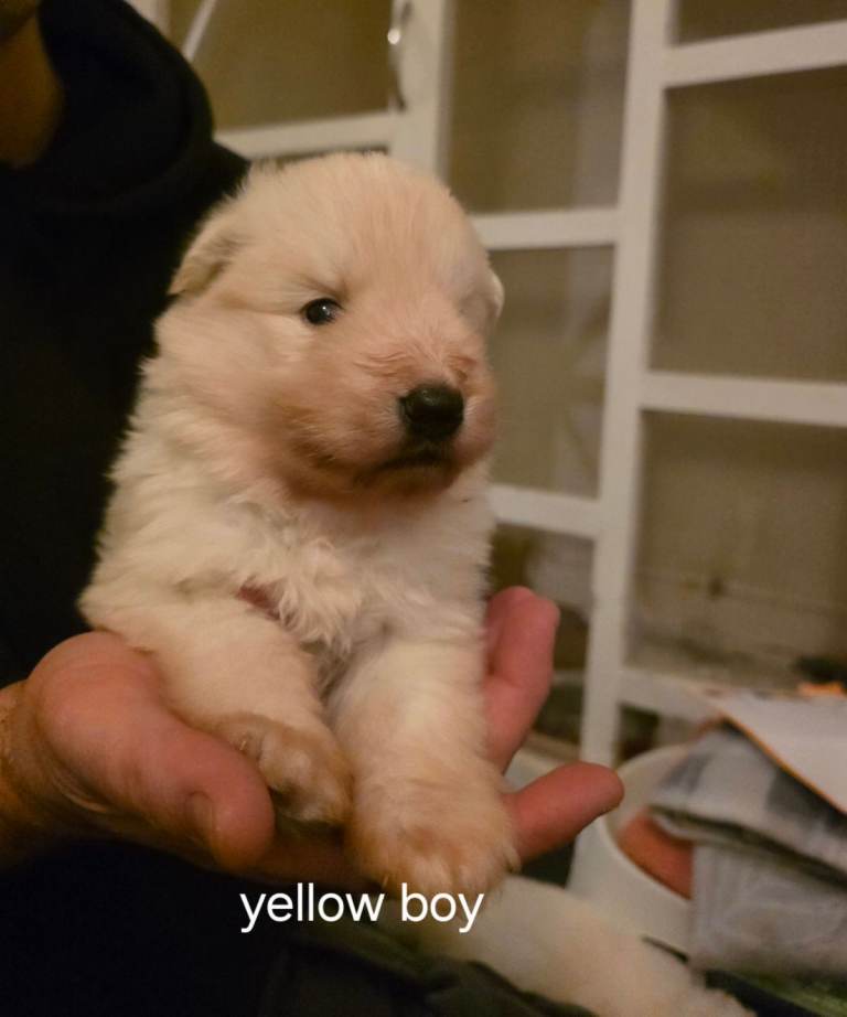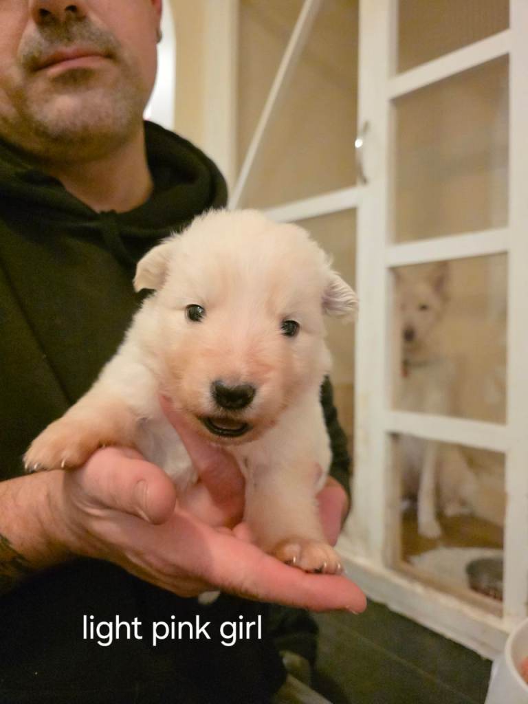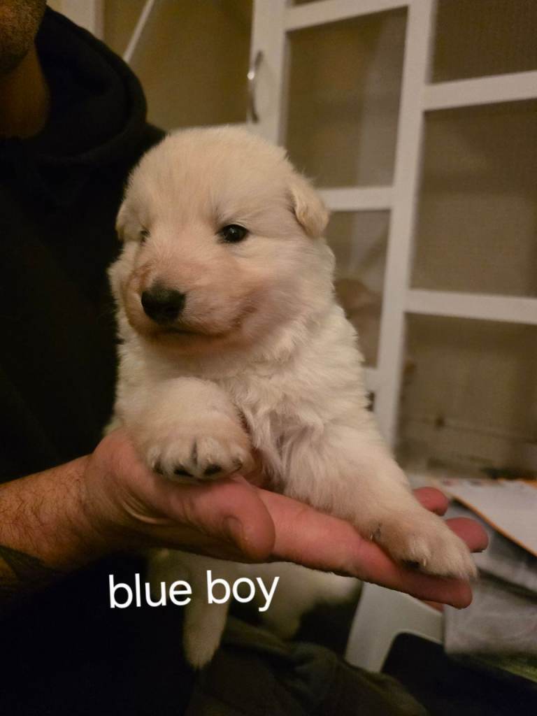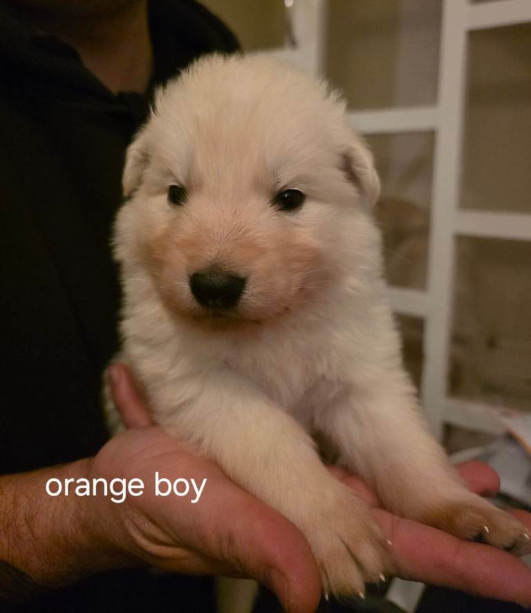 7 beautiful white straight back german shepherd puppies