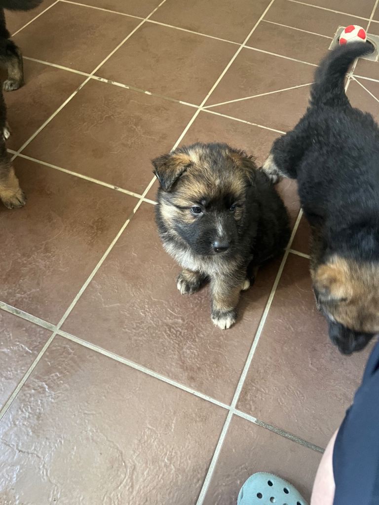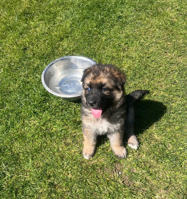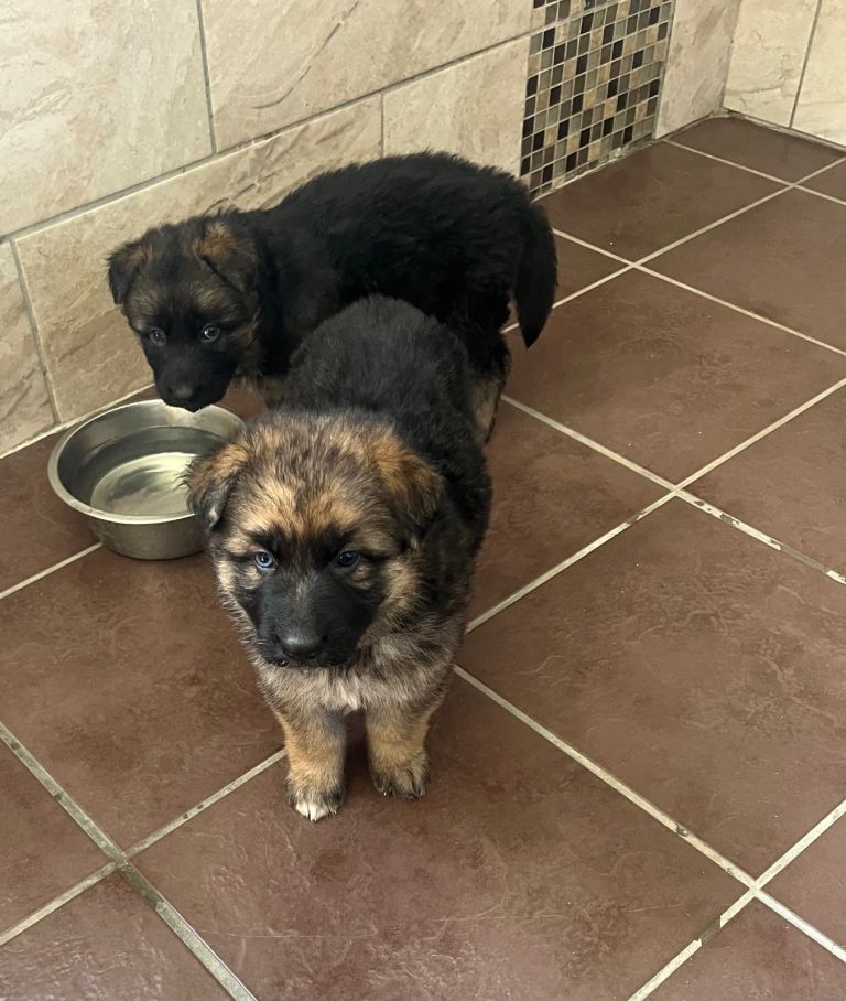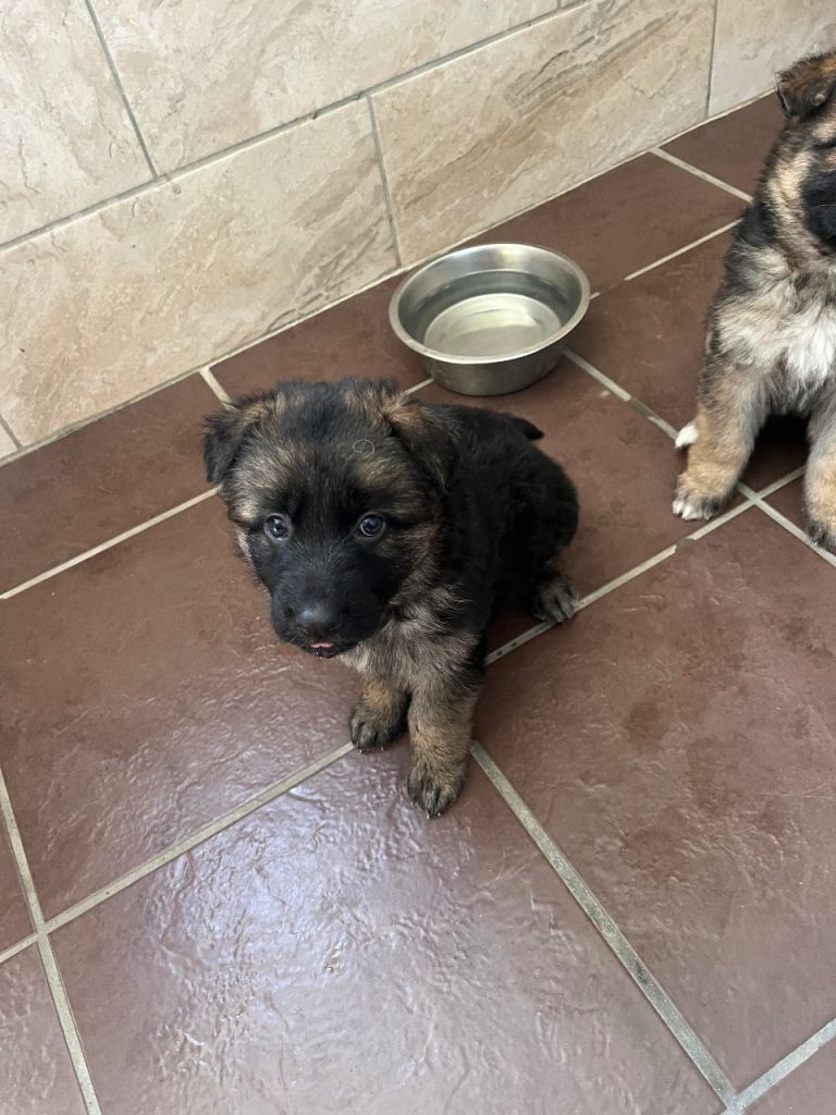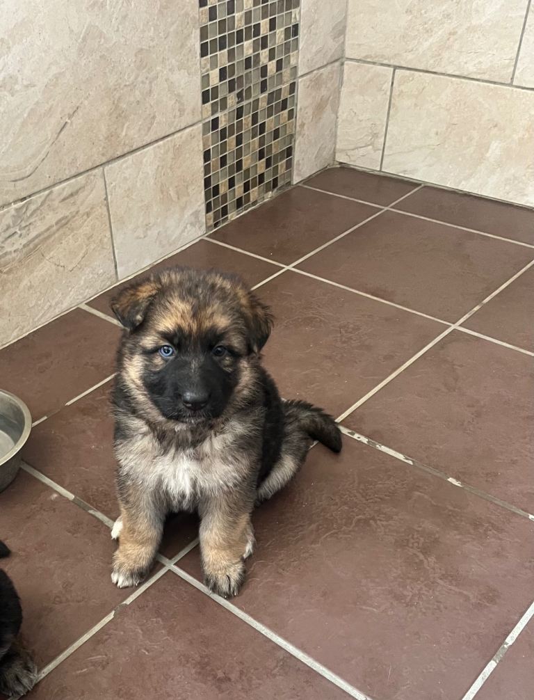 Four gorgeous German shepherd puppies 1 male 3 females. Blue and tan blood line hence the blue eye / eyes. Both parents are our family pets. Excellent temperament raised in our family home, great family pets . Need to be seen to be appreciated great strong pups 5 weeks ready in 3 weeks. Prior to leaving for their loving forever homes they will be vet checked, first vaccine, wormed to date, microchipped and flea treated. No time wasters please only message if genuinely interested. Deposit secures