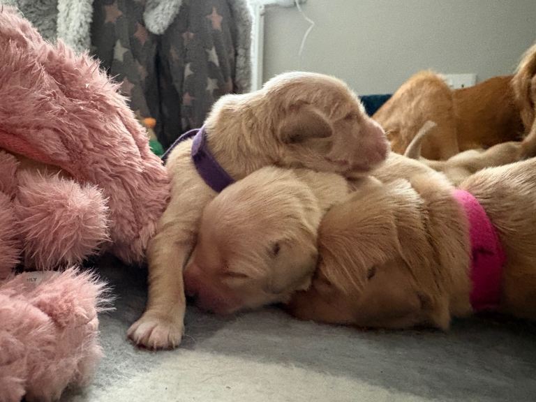 Golden Retriever Puppies – 5 boys 3 girls. Ready Soon Beautiful litter of Golden Retriever puppies looking for loving homes. Mum is our much-loved family dog with a gentle, affectionate temperament and is wonderful with people. Dad is a KC registered Golden Retriever. The puppies have been raised in our home and are used to everyday household noises and lots of handling. Mum can be seen with the puppies. Puppies will leave: • Vet checked • Microchipped • With their first vaccination • With a puppy pack including food they are used to A deposit will secure your puppy. Please message with any questions or to arrange a visit.
