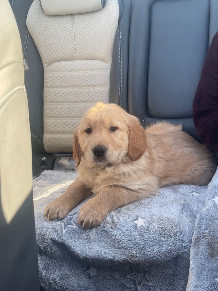 Golden retriever 1 male left. the puppy will be used to normal household noises and have had lots of interaction daily. the puppies will be vet health checked, vaccinated, wormed and microchipped before leaving. The puppy will be 8 weeks old on the 27/01/26 and will be ready for their new homes shortly after.They will surely bring a lot of joy to your home.The puppy will be have anti-flea treatment, vaccinated, wormed, and microchipped with all health checks completed at the vet. I will provide for puppy; a bag of their current food, a puppy collar, blanked, first toy, a health record book for each puppy.