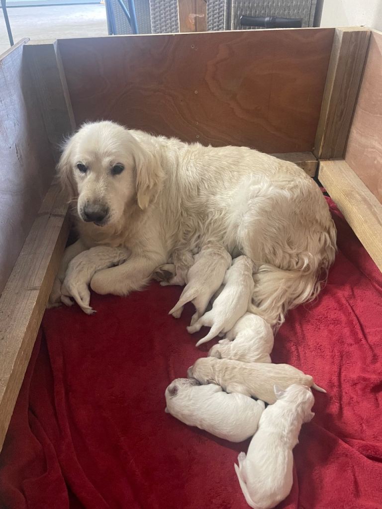 Our pet golden retriever has given birth to eight beautiful healthy pups, 6 girls and 2 boys. Looking for their forever loving homes. Father dog, also pure bred golden retriever, in last pic.